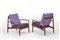 Coppia di poltrone. Produzione France & Son, Danimarca, 1954ca. Struttura in legno massello di teak, cuscini imbottiti e rivestiti in tessuto viola. Recante marchio del produttore alla base della seduta. (cm 73x73x73) (lievi difetti)