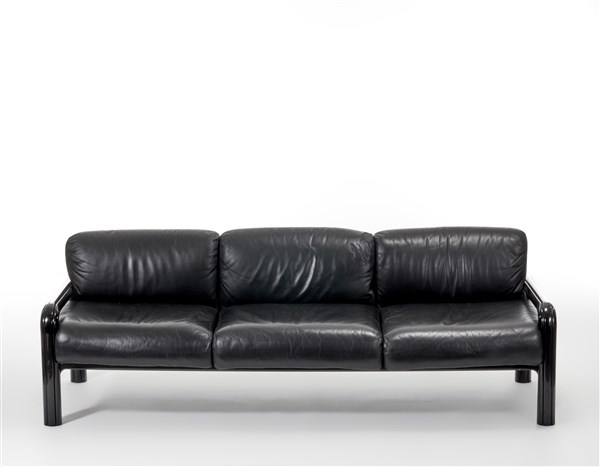 Three seater sofa. Produced by Knoll International, Usa, 1977. Cushions covered in leather, black lacquered metal structure. Marked on the pillows. (224x72x90 cm.) (slight defects)