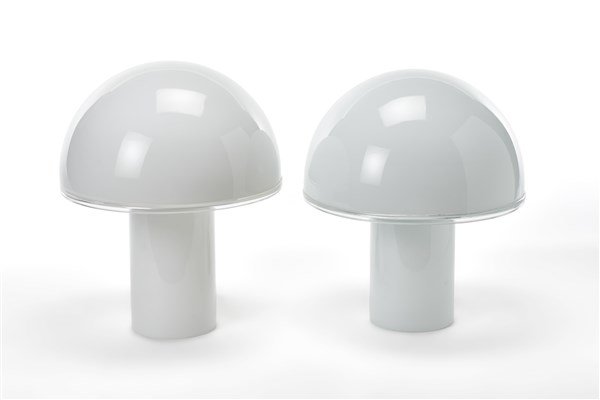 Coppia di lampade da tavolo modello "Onfale". Produzione Artemide, Milano, anni '70. Vetro trasparente incolore e lattimo. (h cm 41)