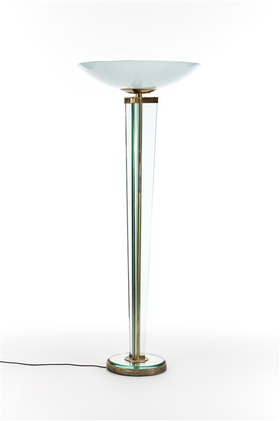 Lampada da terra. Italia, anni '40. Fusto ad elementi in cristallo molato e ottone, paralume in vetro incolore acidato sulla superficie interna. (h cm 165) (lievi difetti)