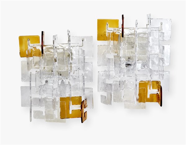 Pair of wall lamps. Italy, 1970s. Structure in white painted steel and angular pendants in transparent colorless and amber Murano glass printed and corrugated. (slight defects and small losses)