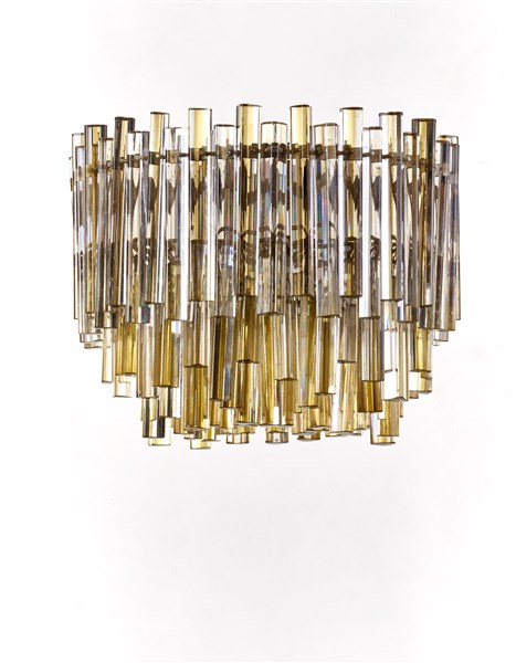 Suspension lamp of the series "Trilobo". Murano, 1970s. Structure in white painted metal, trefoil pendants in pagliesco and colorless sommerso glass. (d 43 cm.) (slight defects and small losses)