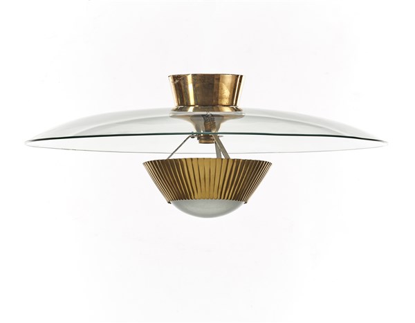 Plafoniera. Milano, anni '40. Struttura in ottone e schermo diffusore a parabola in cristallo trasparente. (d cm 60) (lievi difetti)