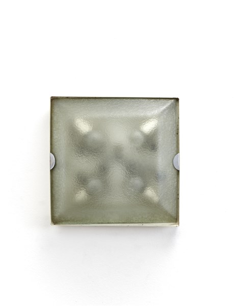 Lampada a plafone modello "1940". Milano, anni '50. Struttura in metallo verniciato bianco, diffusore in vetro stampato e acidato. (cm 35,5x35,5) (lievi difetti)