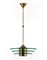 Lampada a sospensione composta da tre dischi di diametro digradante, in cristallo molato e temperato di forte spessore. Struttura in ottone tornito spazzolato. Italia, anni '50. (h cm 89; d cm 45)
