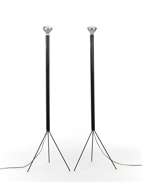 Due lampade da terra modello "Luminator". Produzione Flos, Milano, disegno del 1954. Metallo smaltato nero. Recanti etichetta adesiva del produttore. (h cm 186) (lievi difetti)