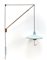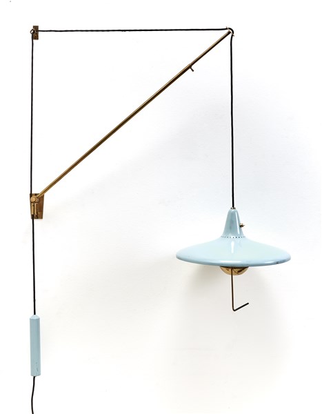 Lampada da parete con braccio orientabile. Milano, anni '50. Ottone e metallo verniciato azzurro e bianco. Recante etichetta adesiva del produttore all'interno del paralume. (cm l max 145) (difetti)