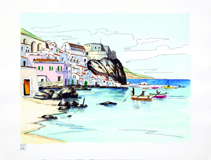 ALDO RISO(SANTA MARIA DI LEUCA 1927)'Chianalea di Scilla'incisione acquerellata a manocm 60x80firmata in basso a sinistratimbro a secco Grafica d'Arte Lombardi