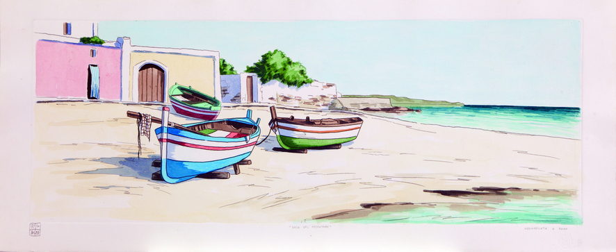 ALDO RISO(SANTA MARIA DI LEUCA 1927)'Casa del pescatore'incisione acquerellata a manocm 40x100firmata in basso a sinistratitolata al centrotimbro a secco Grafica d'Arte Lombardi
