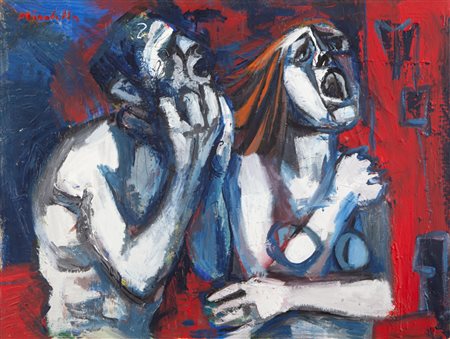 SARO MIRABELLA(CATANIA 1914 - ROMA 1972)'Adamo ed Eva'anno 1967olio su tela cm 54x73firmato in alto a sinistra firmato e datato al retroopera contiene segni di cracklË