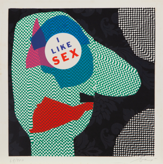 ENRICO BAY(MILANO 1924 - VERGIATE 2003)'I like sex'serigrafia a colori su carta anno 1967esemplare n. 69/100cm 40x40firmata in basso a destra numerata in basso a sinistraOpera pubblicata sul Catalogo 'BAJ - Generali delle Stampe Originali' a pag. 84