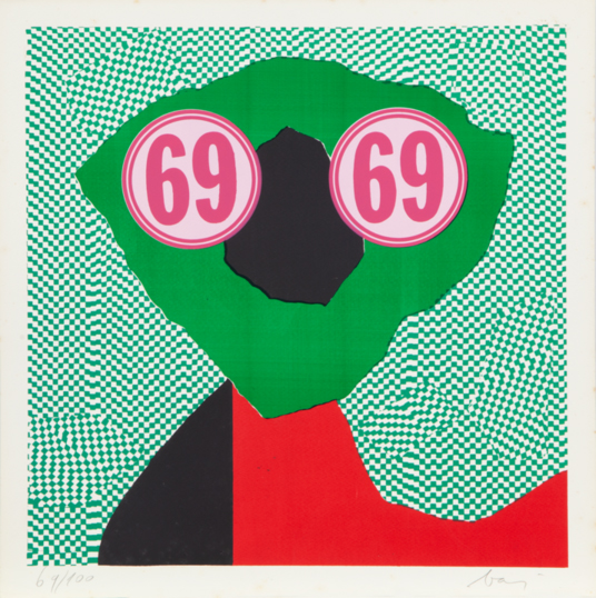 ENRICO BAY(MILANO 1924 - VERGIATE 2003)'Sessantanove'serigrafia a colori su carta anno 1967esemplare n. 69/100cm 40x40firmata in basso a destra numerata in basso a sinistraOpera pubblicata sul Catalogo 'BAJ - Generali delle Stampe Originali' a pag. 84