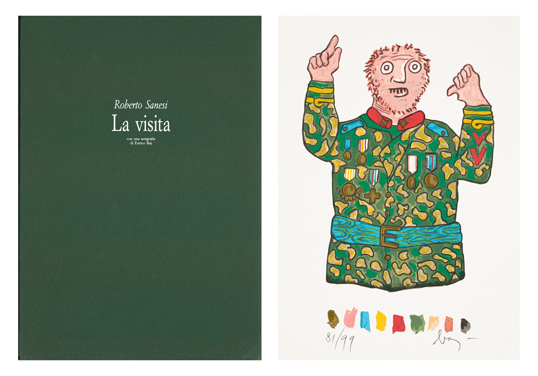 Cartella contenente testo di presentazione di Roberto Sanesi e una serigrafia polimaterica di Enrico Baj recante firma e numerazione (Esemplare 81/99) a matita al fronte