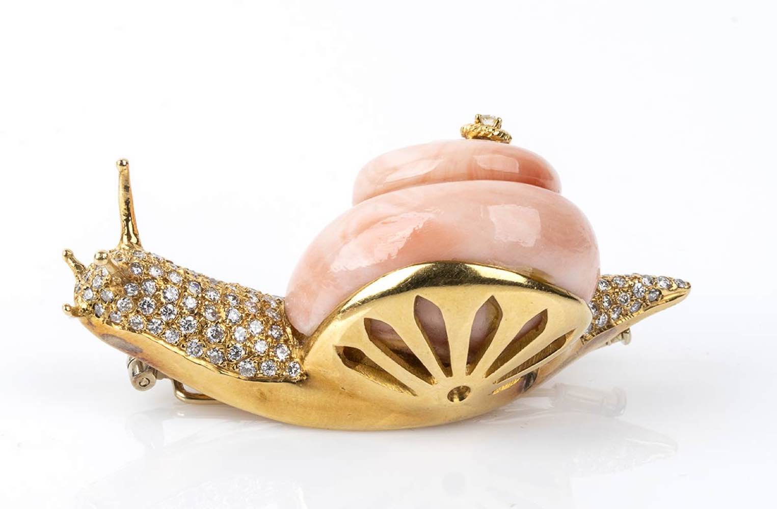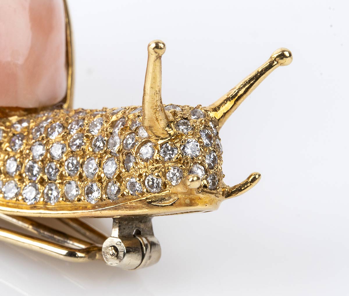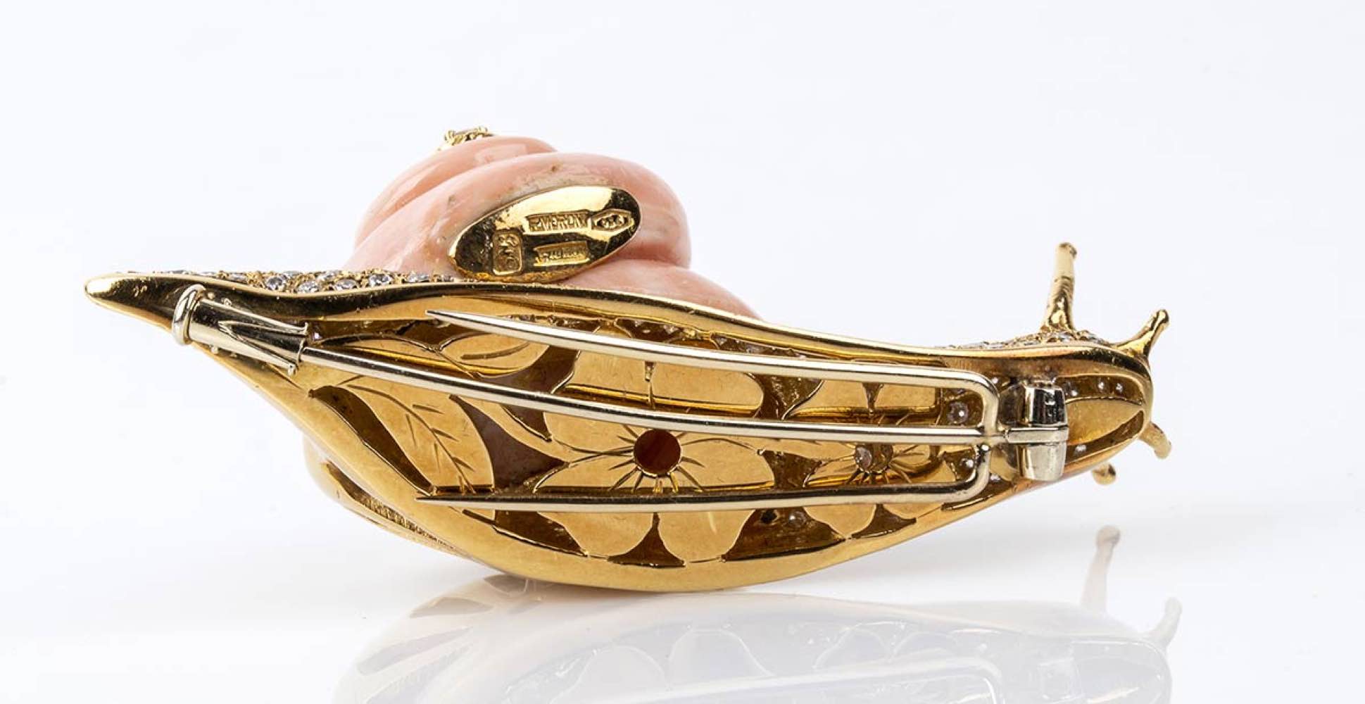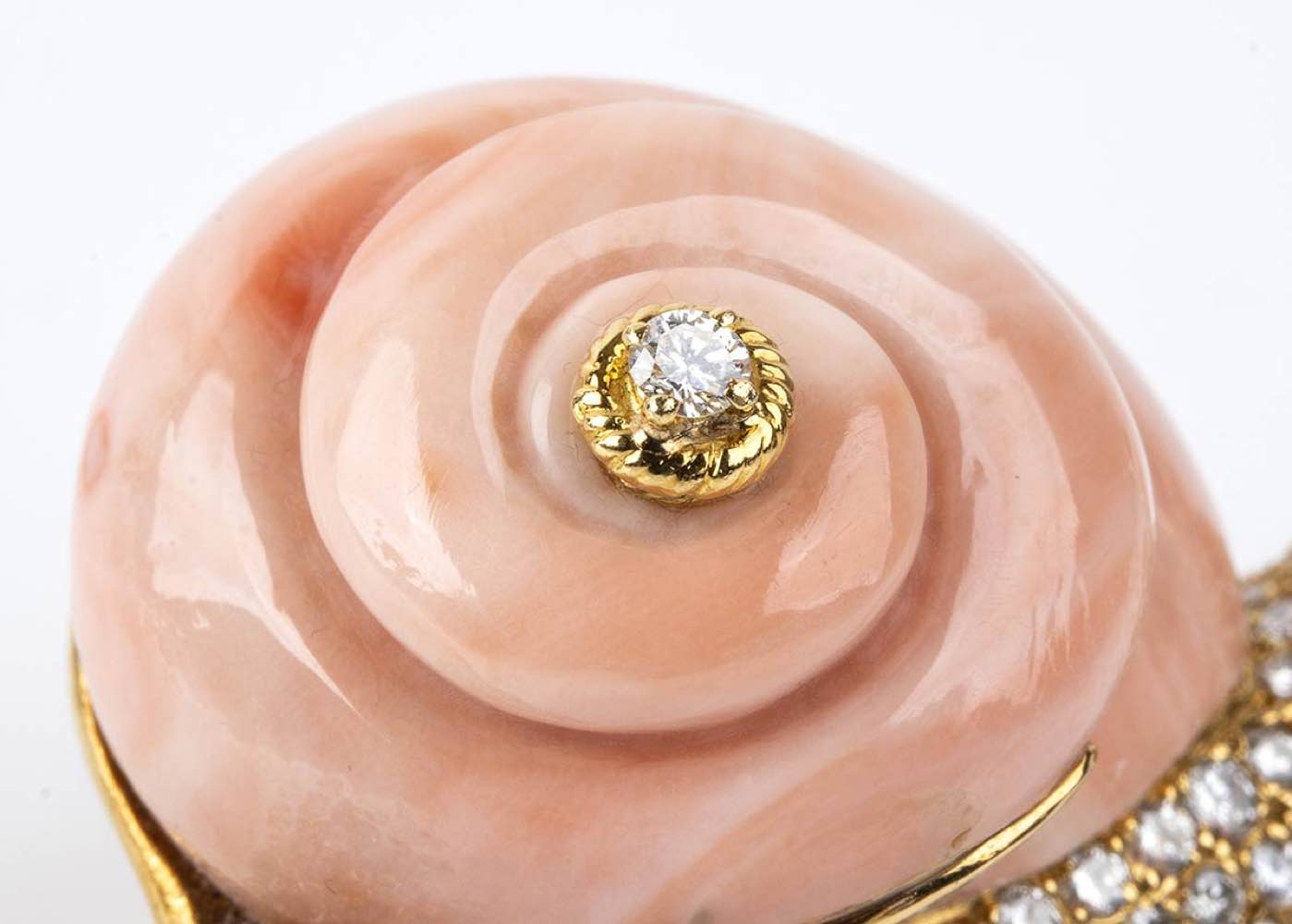 Spilla a "chiocciola" in oro, diamanti e corallo rosa - manifattura FILIPPO MORONI, ROMA