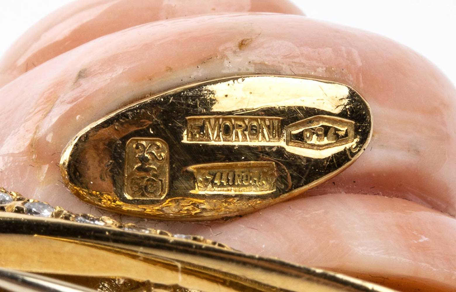 oro giallo 18k, guscio in corallo rosa (corallium regale), corpo in pavé di diamanti taglio brillante 3,10 ct circa, G-H, VVS-SI. Firmata "F. MORONI" e punzonata "750" e "441 ROMA". Dimensioni 80 x 60 mm. Peso 36,7 gr. Stato di conservazione: ***** eccellente.