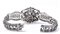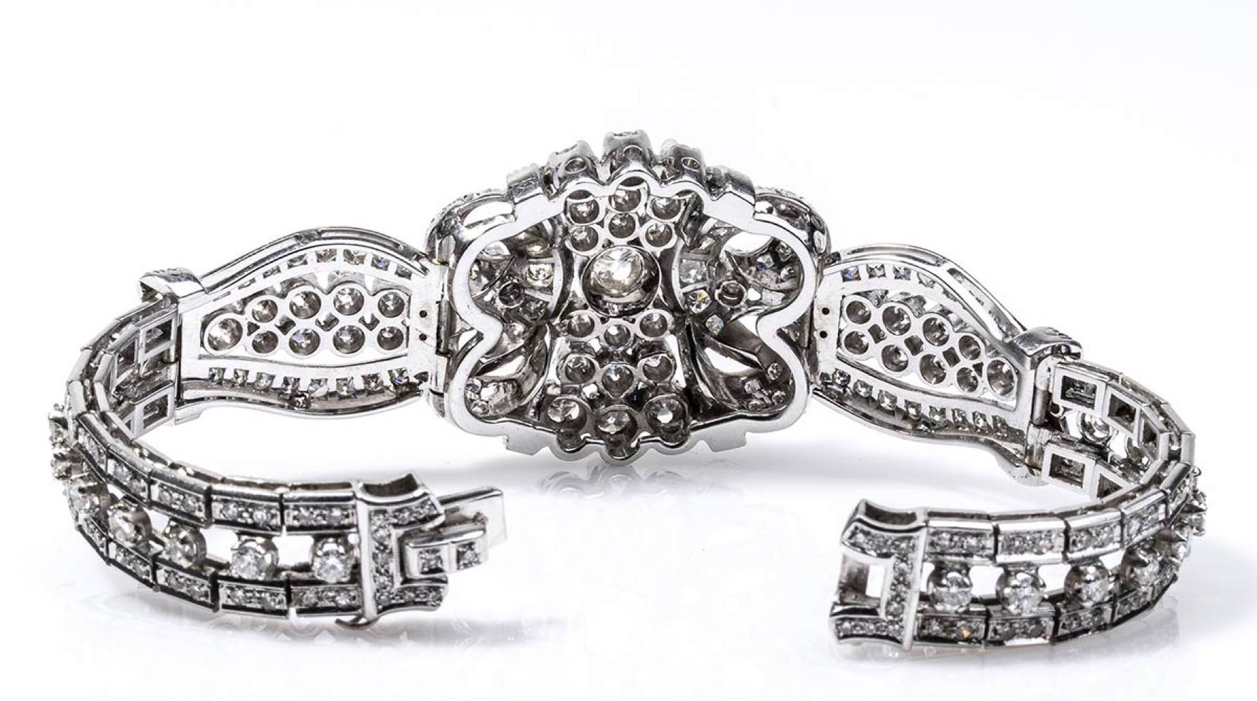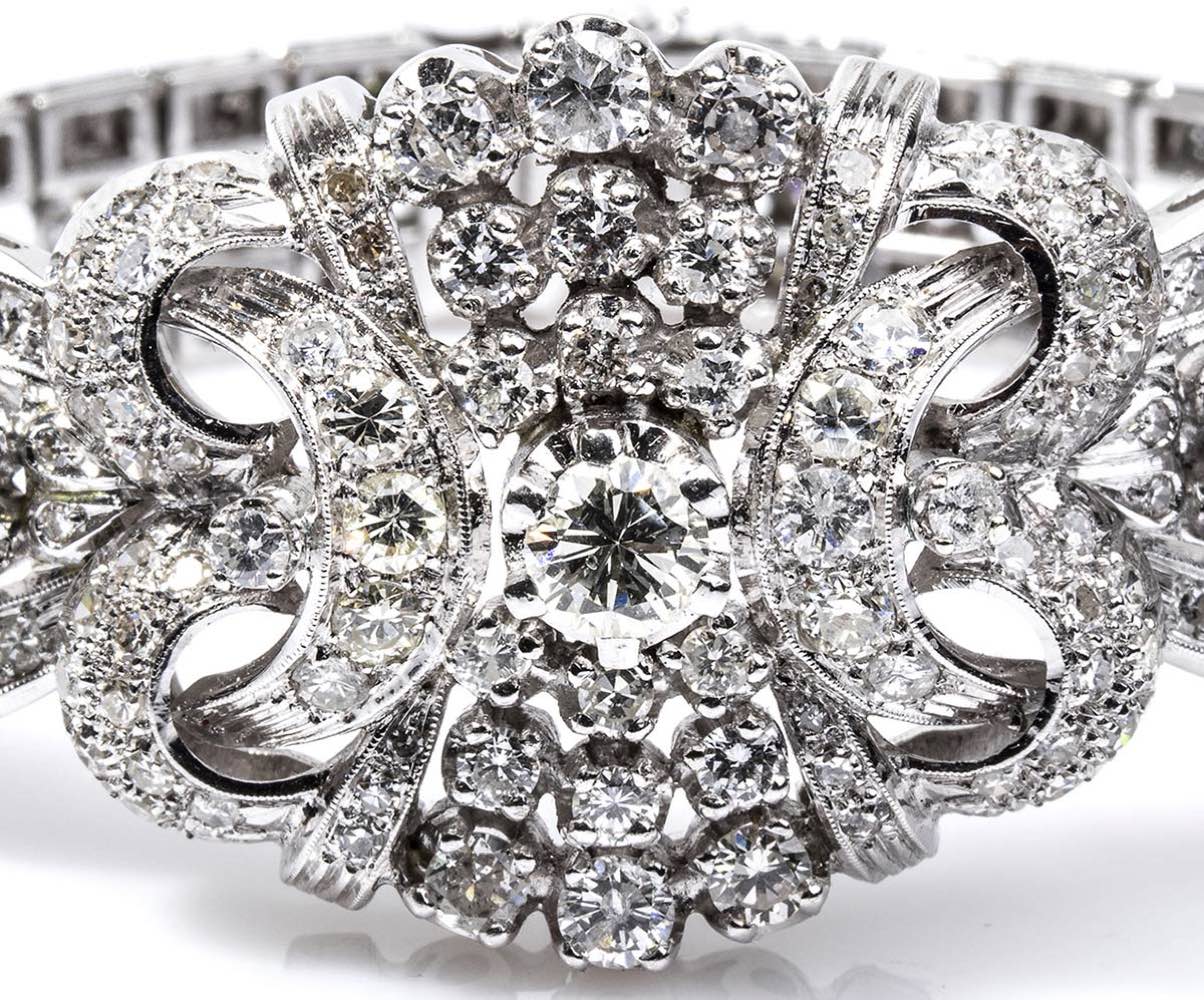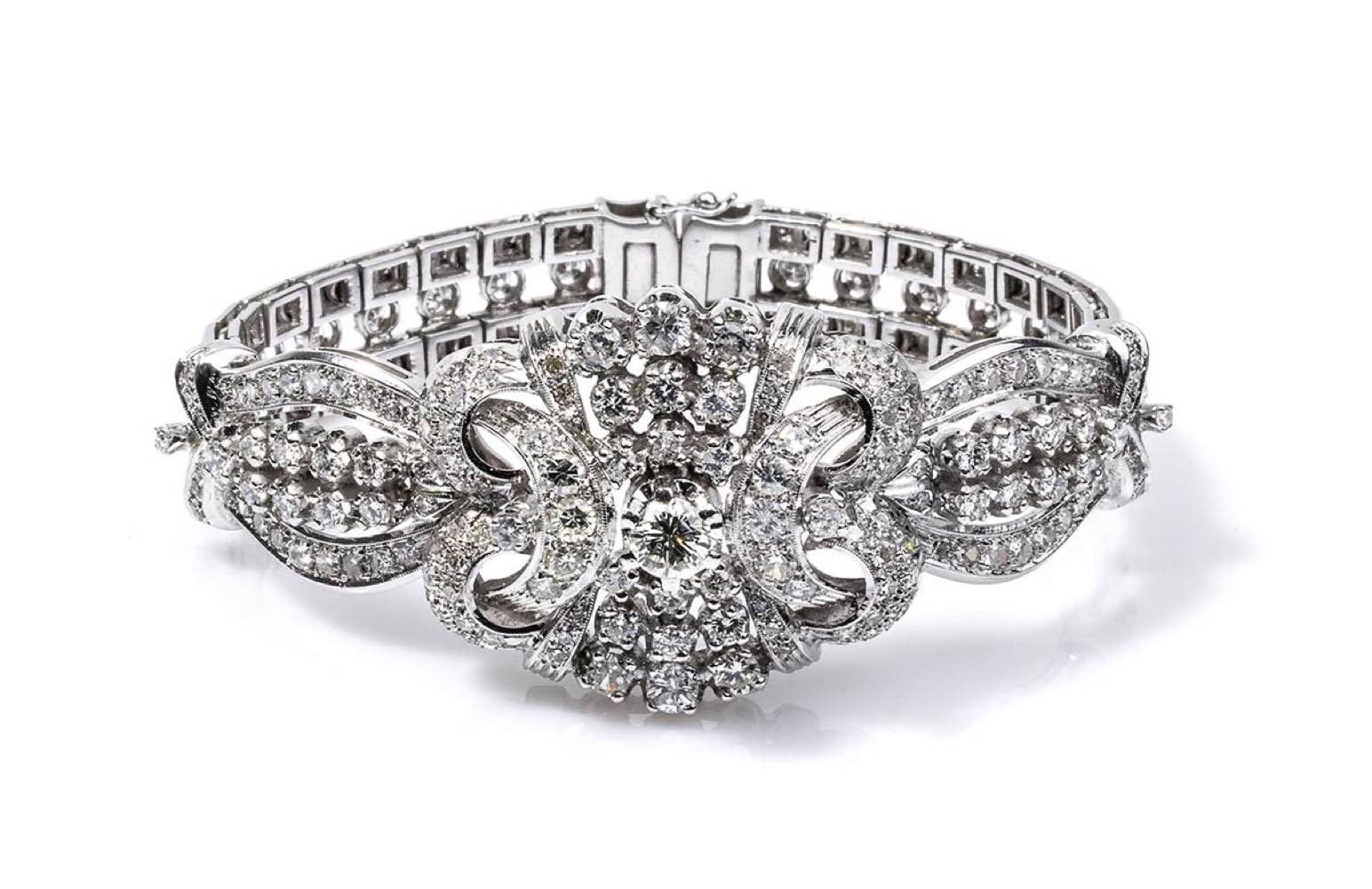 oro bianco 18k con diamanti realizzato a mano in Italia. Diamanti taglio baguette, brilliante e huit/huit 15,50 ct circa, ca. G-H, VVS/VS. Diamante centrale 0,60 ct circa, G, VVS. Lunghezza 19 cm, larghezza da 1 a 3 cm. Peso 51,7 gr. Stato di conservazione: ***** eccellente.