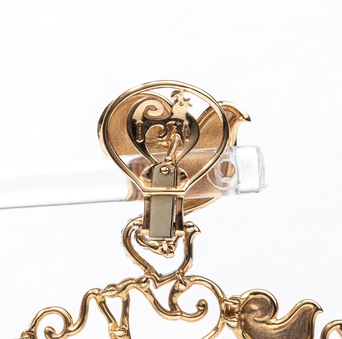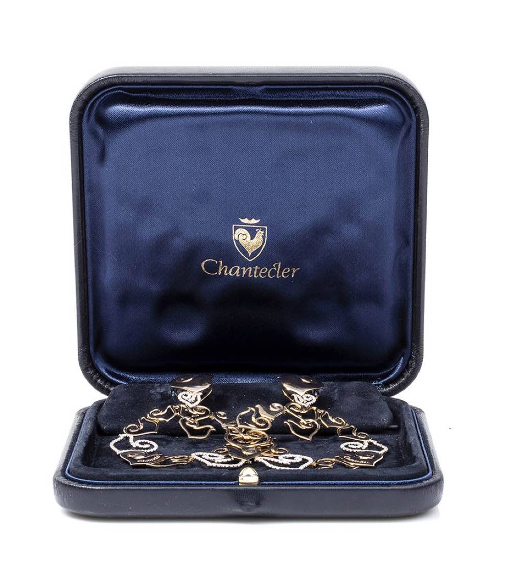 in oro rosa e bianco con diamanti, di forma circolare con loghi della casa. Punzonati "750", "CHANTECLER" e "1056 NA". Diamanti taglio brilliante 2,00 ct circa, F-G, VVS. Diametro 5,7 cm, lunghezza 7,8 cm. Peso 26,30 gr. Stato di conservazione: ***** eccellente.