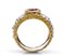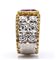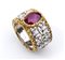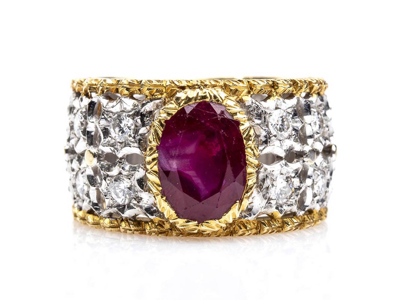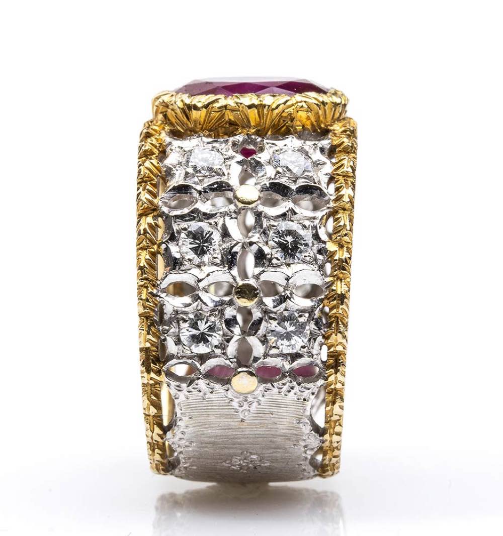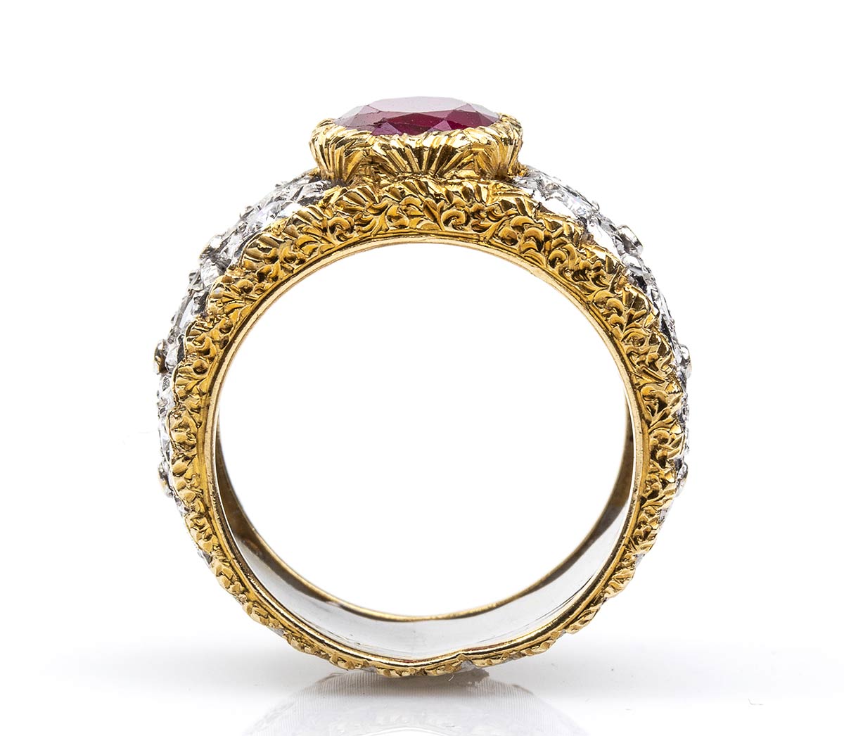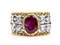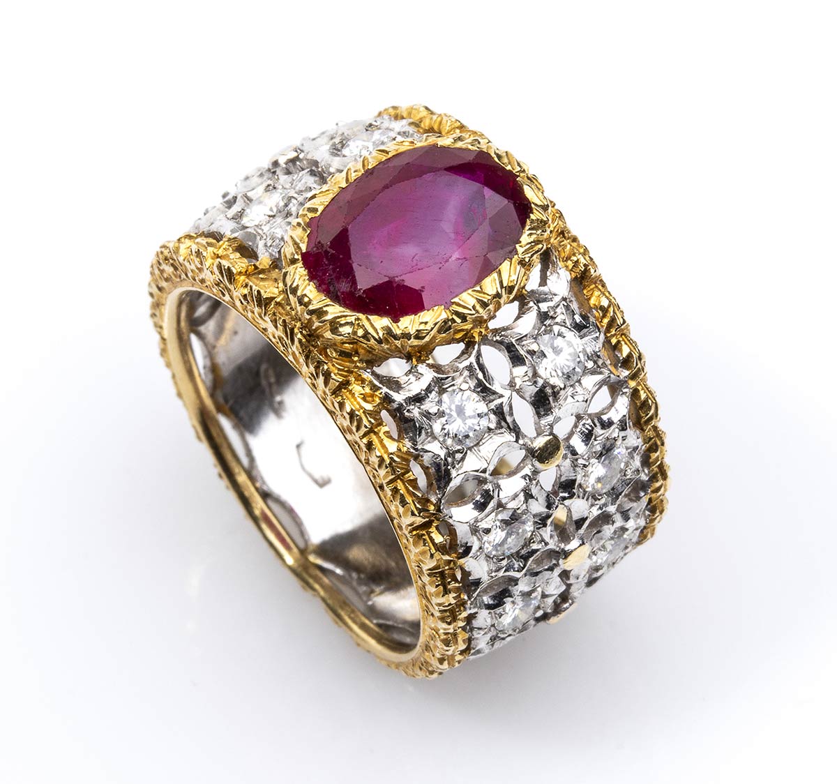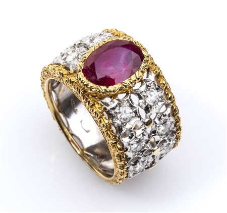 oro giallo e bianco 18k traforato e cesellato a mano. Rubino centrale taglio ovale sfaccettato 2,50 ct circa e diamanti taglio brilliante 0,60 ct circa. Marchi non leggilbili. Dimensioni frontali 12 x 20 mm. Misura IT 10 - Misura US 5. Peso 8,5 gr. Stato di conservazione: ***** eccellente.