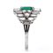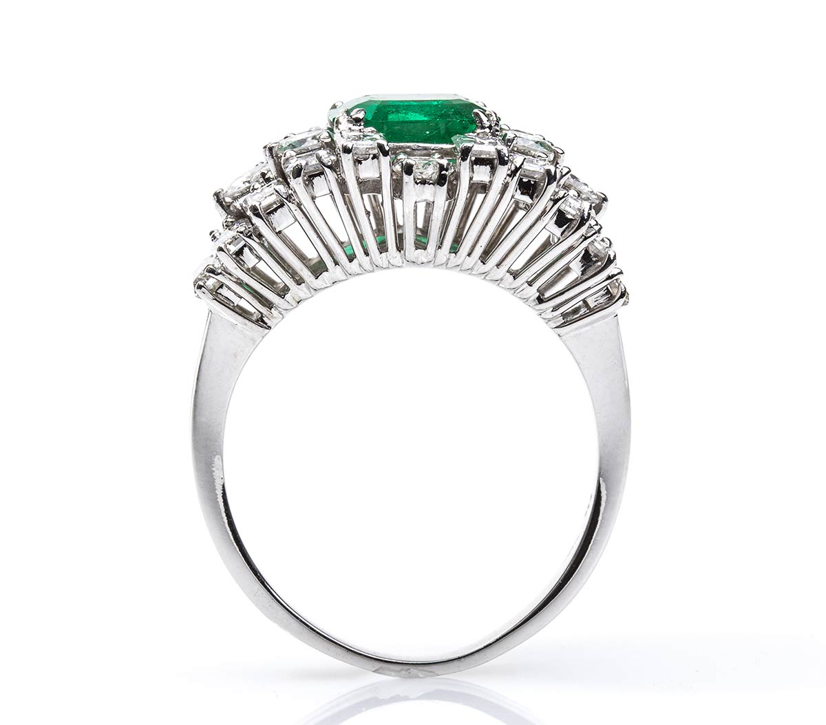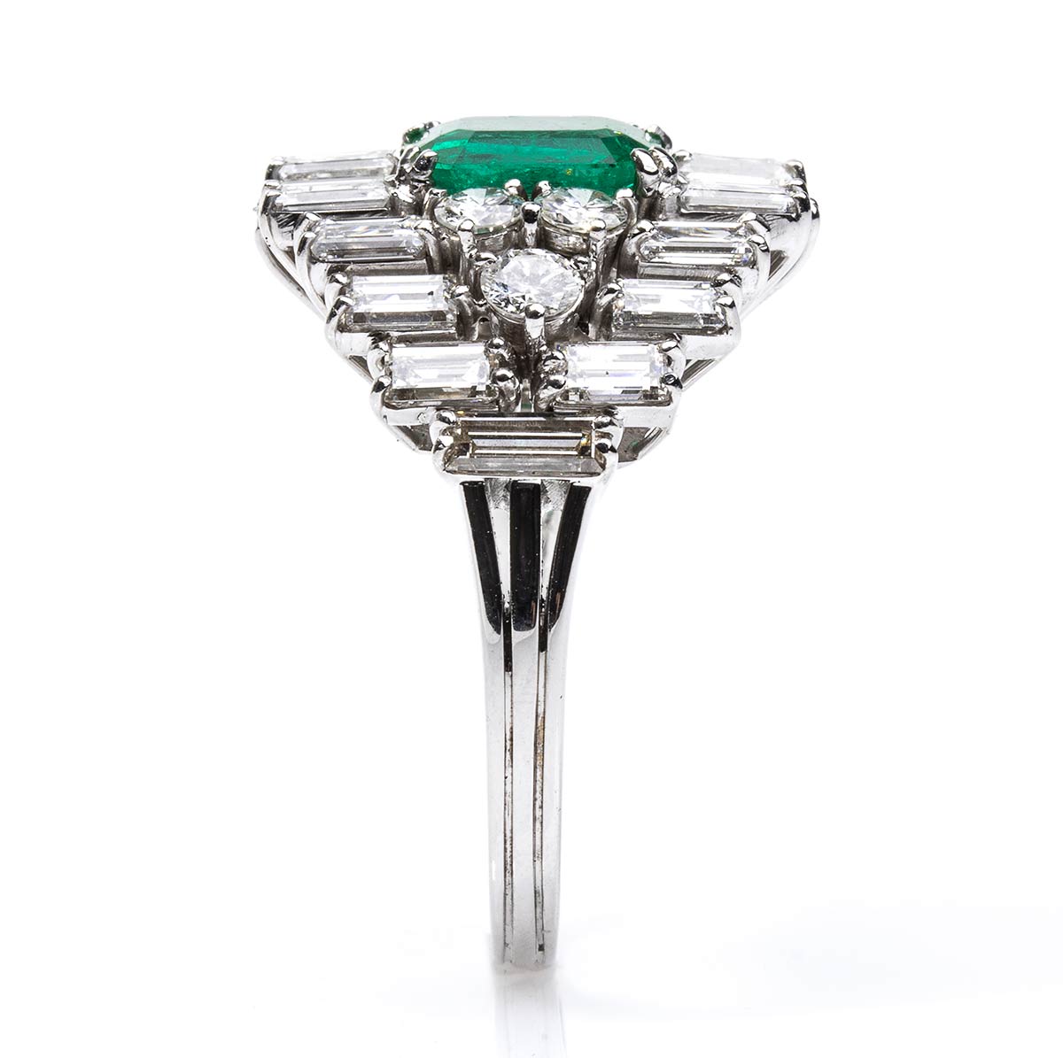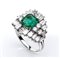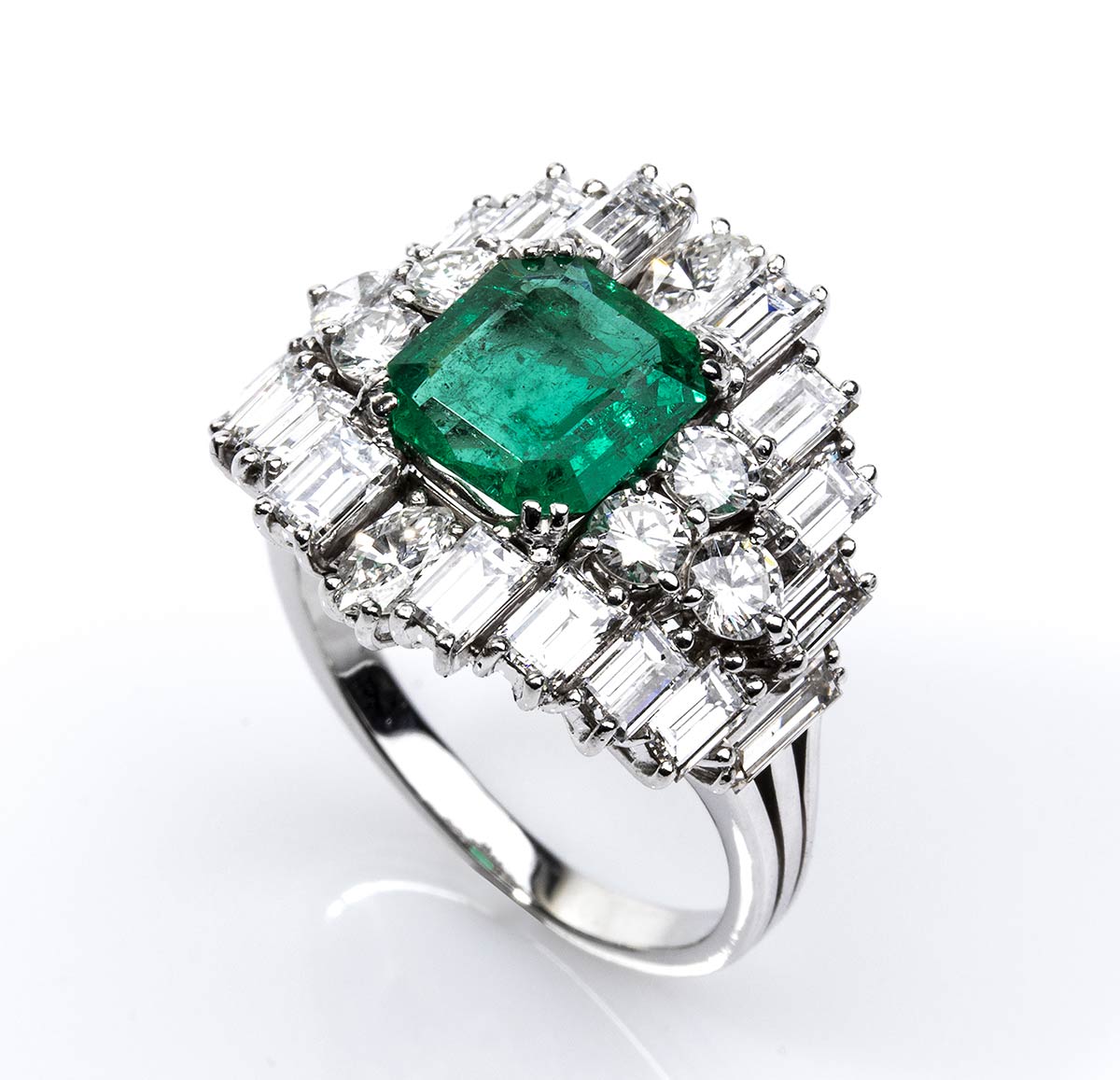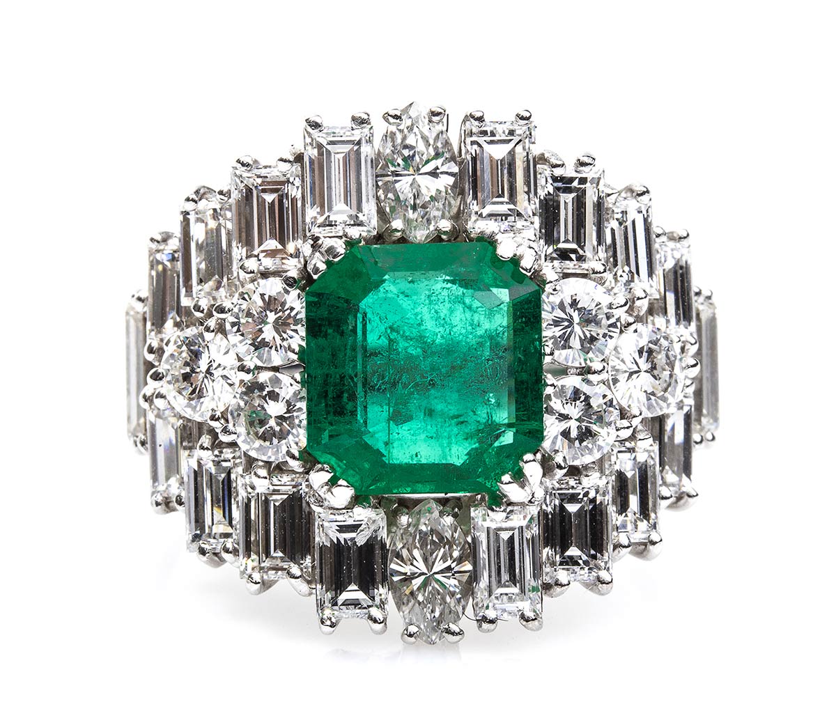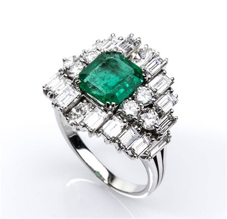 oro bianco 18k incastonato con smeraldo Colombiano rettangolare 1,60 ct circa, contornato da diamanti taglio baguette-marquise-brilliante 3,10 ct circa, F-G, VVS. Punzonato "750". Dimensione fronte 21 x 19 mm. Peso 9,4 gr. Misura IT 18 - Misura US 8. Stato di conservazione: ***** eccellente.