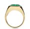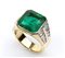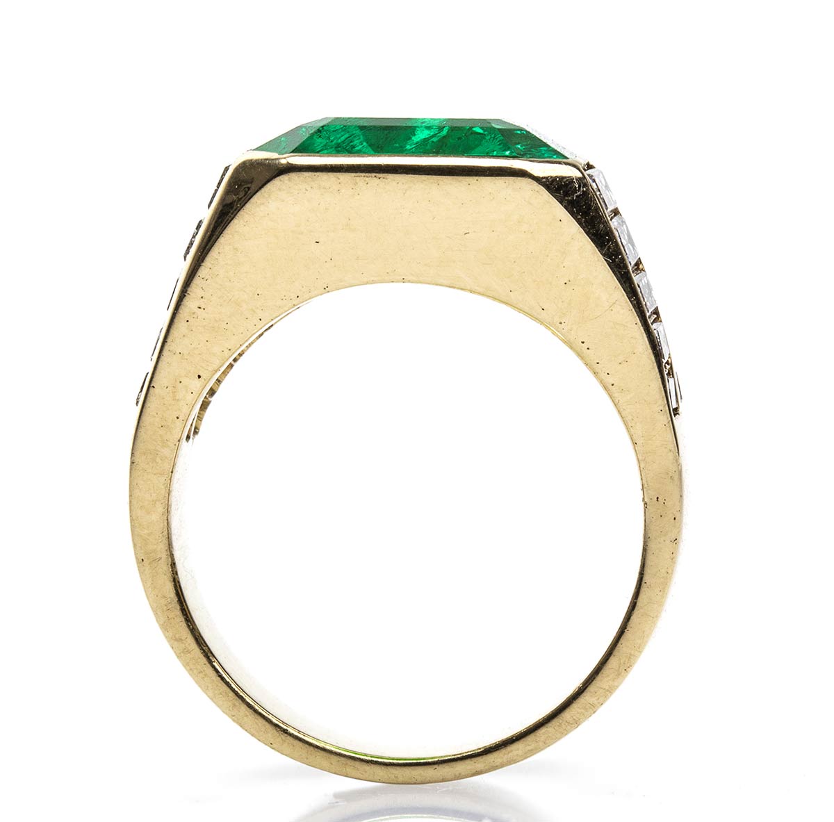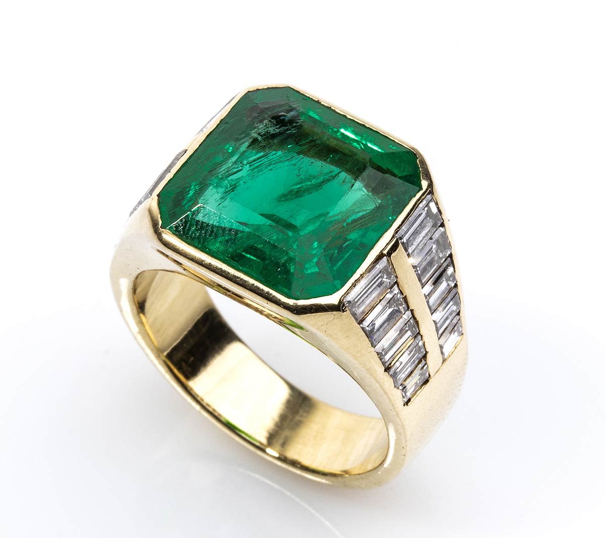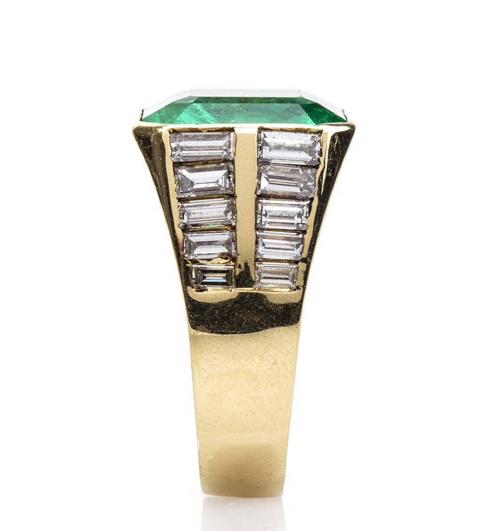 oro giallo 18k con smeraldo e diamanti laterali. Smeraldo colombiano verde intenso taglio rettangolare ad angoli tronchi 6,20 ct circa. Diamanti taglio rettangolare a gradini 1,30 ct, colore G, purezza VVS. Dimensioni frontali 13 x 18 mm. Misura IT 12 - Misura US 6. Peso 11,25 gr. Stato di conservazione: ***** eccellente. Accompagnato da certificato di verifica gemmologica Ce.S.Ar. Centro Studi Archeometrici.