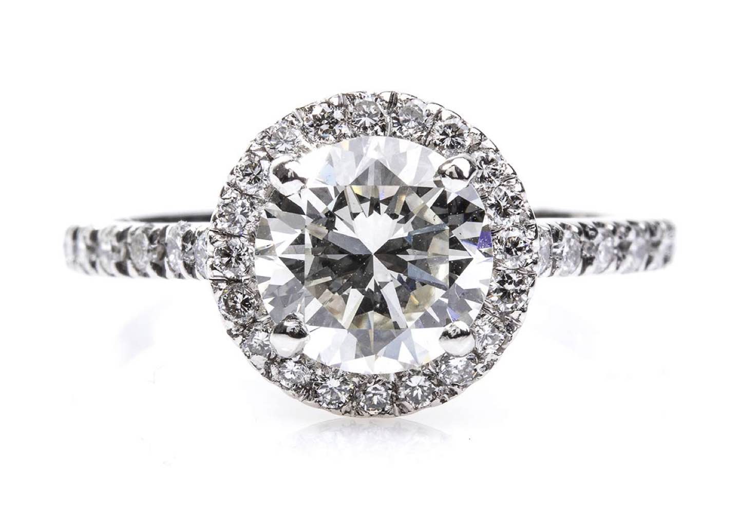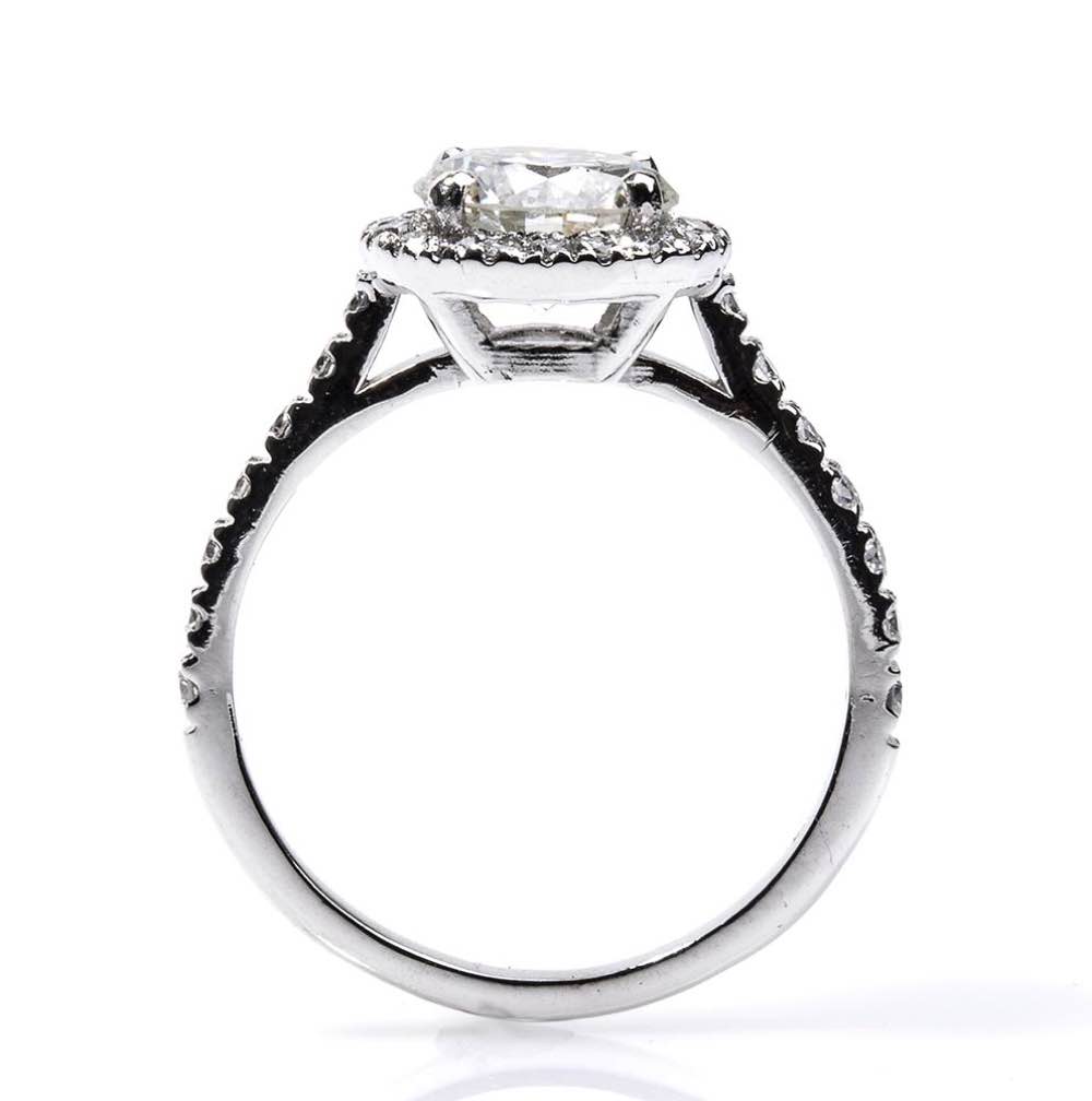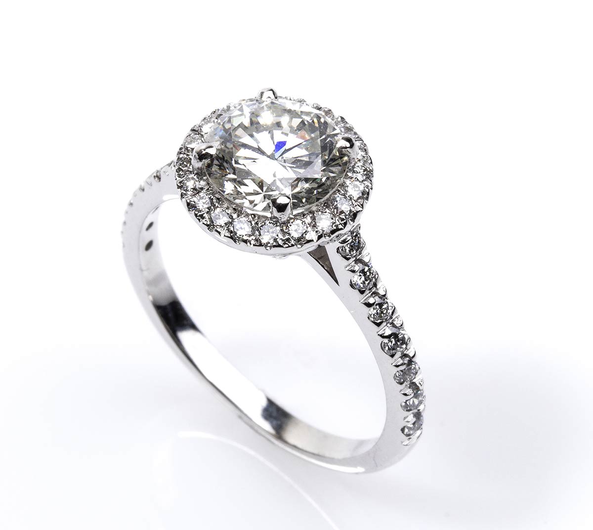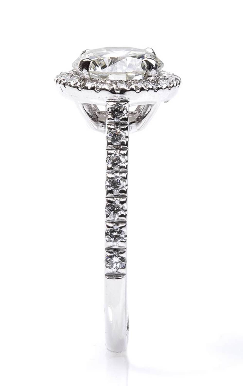 oro bianco 18k, incastonato con diamante centrale taglio brilliante 1,20 ct circa, H-I, VVS2, contornato da altri diamanti taglio brilliante 0,55 ct circa, G-H, VVS. Punzonato "750". Dimensioni fronte 9,5 mm. Peso 2,8 gr. Misura IT 10 - Misura US 5. Stato di conservazione: ***** eccellente.