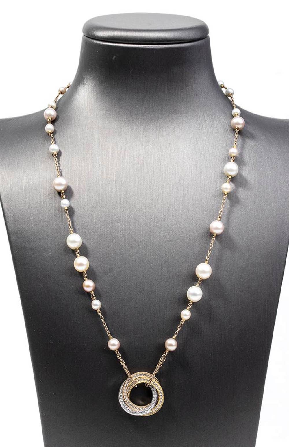 oro giallo, rosso e bianco 18k, collezione "Trinity". La collana è impreziosita da perle bianche e rosate di diametro da 4 a 7 mm, pendente Trinity con pavé di 105 diamanti taglio brilliante 0,54 ct circa, F-G, VVS. Punzonato "Cartier", "750", "RS3873", "I Y ". Lunghezza collana 42 cm. Diametro cerchio pendente 16 mm. Peso 11,9 gr. Stato di conservazione: ***** eccellente.