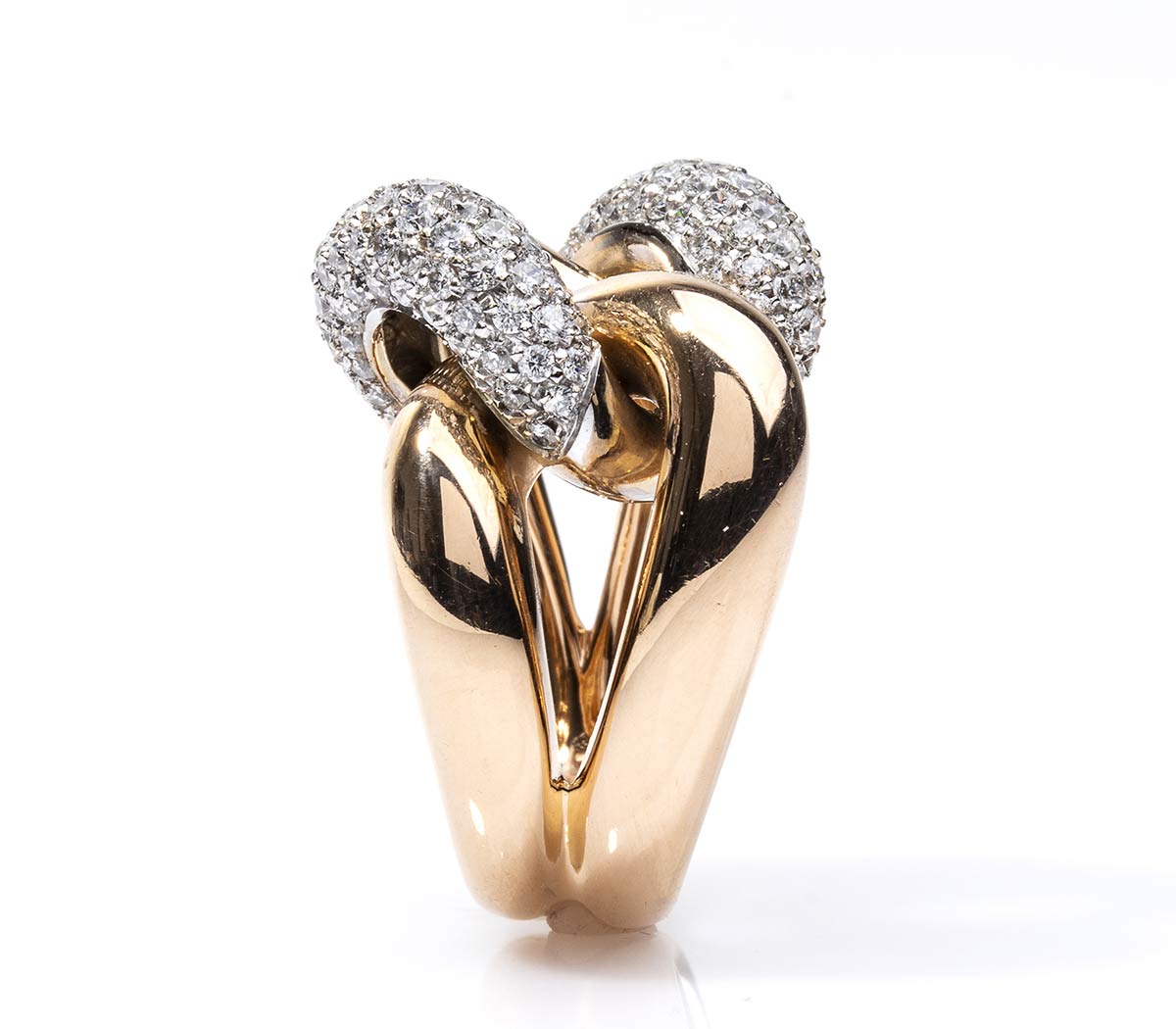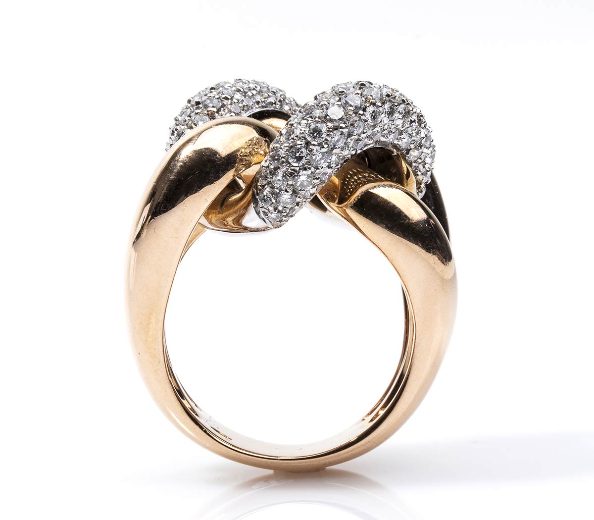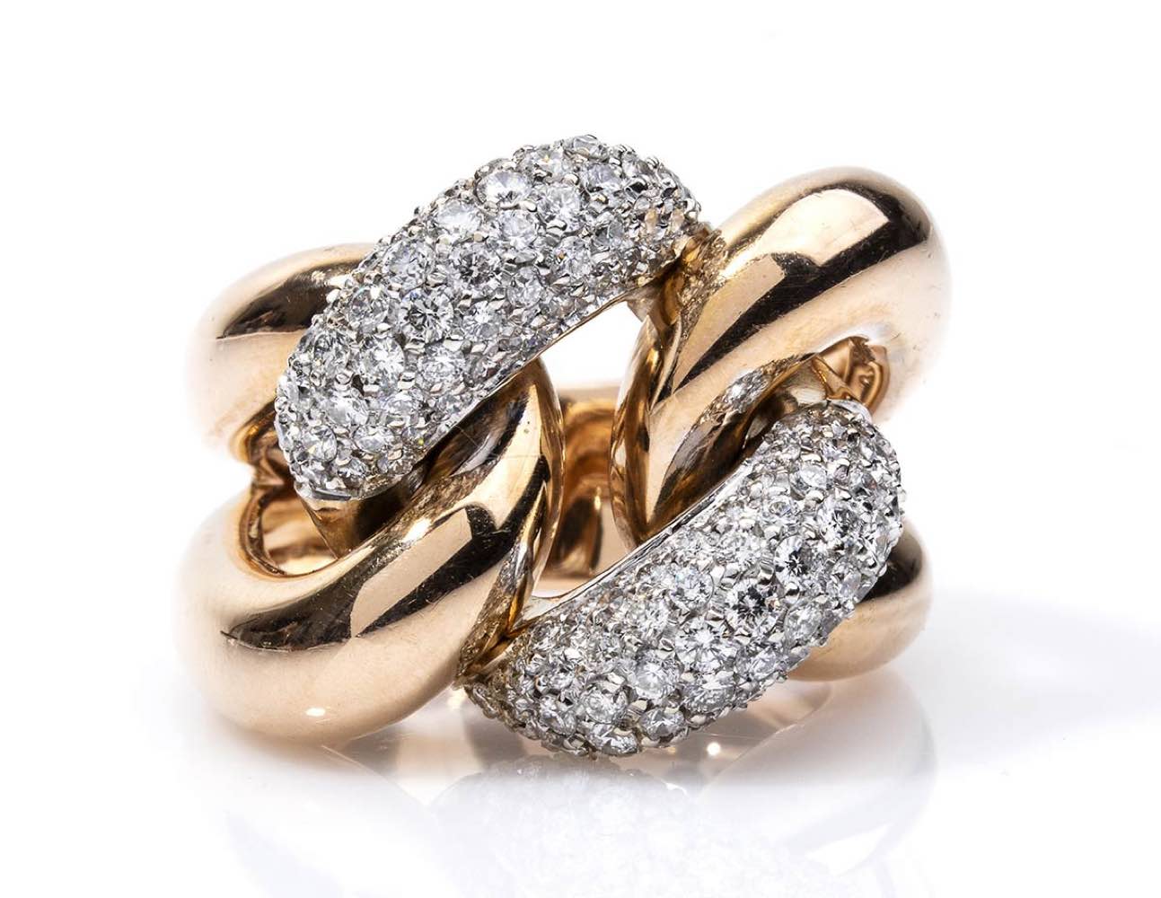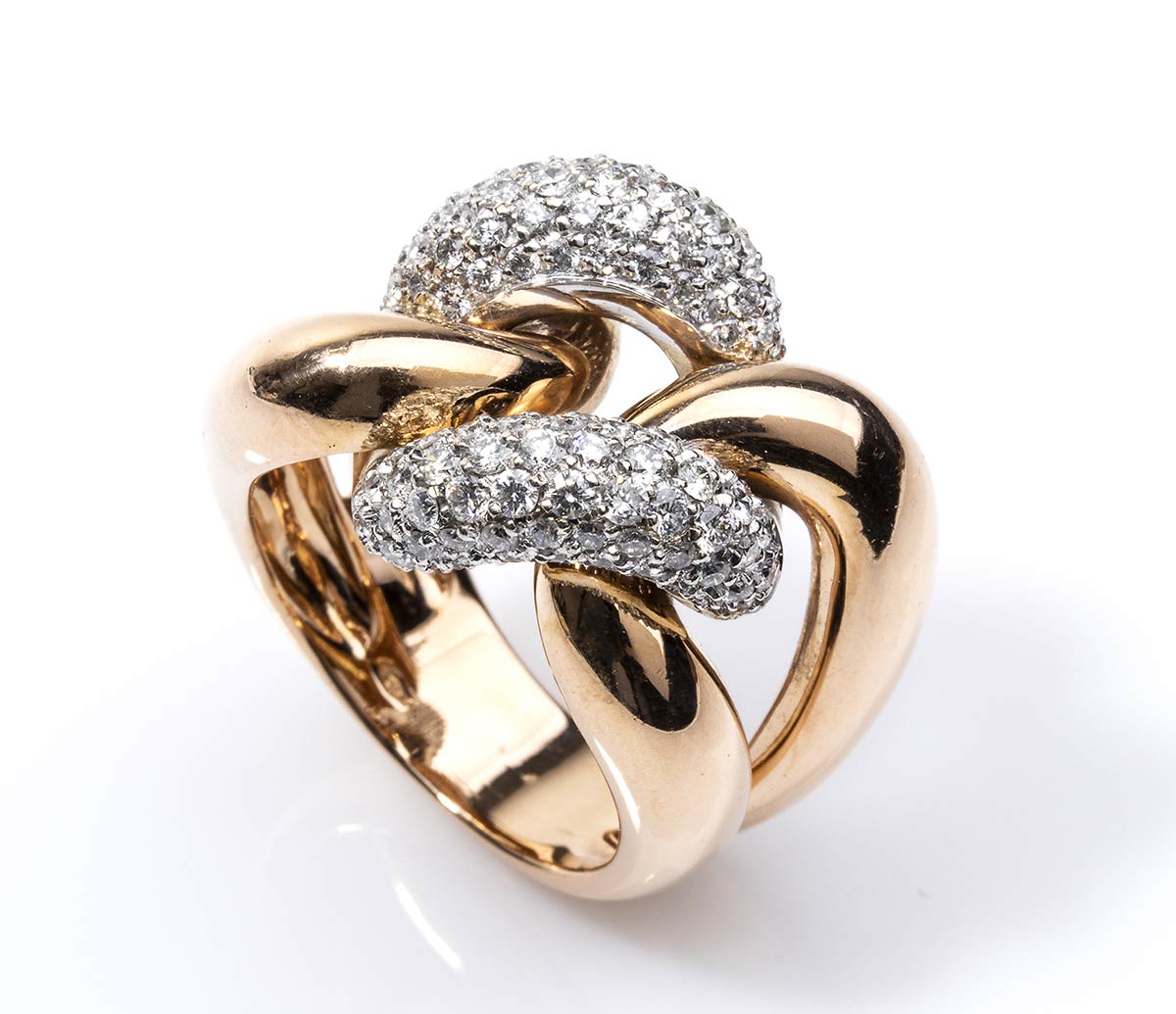 oro rosa 18k, modello a nodo con diamanti taglio brilliante 2,00 ct circa, G, VVS. Punzonato "750". Dimensioni fronte 26 x 20 mm. Misura IT 17 - Misura US 8. Peso 20 gr. Stato di conservazione: ***** eccellente.