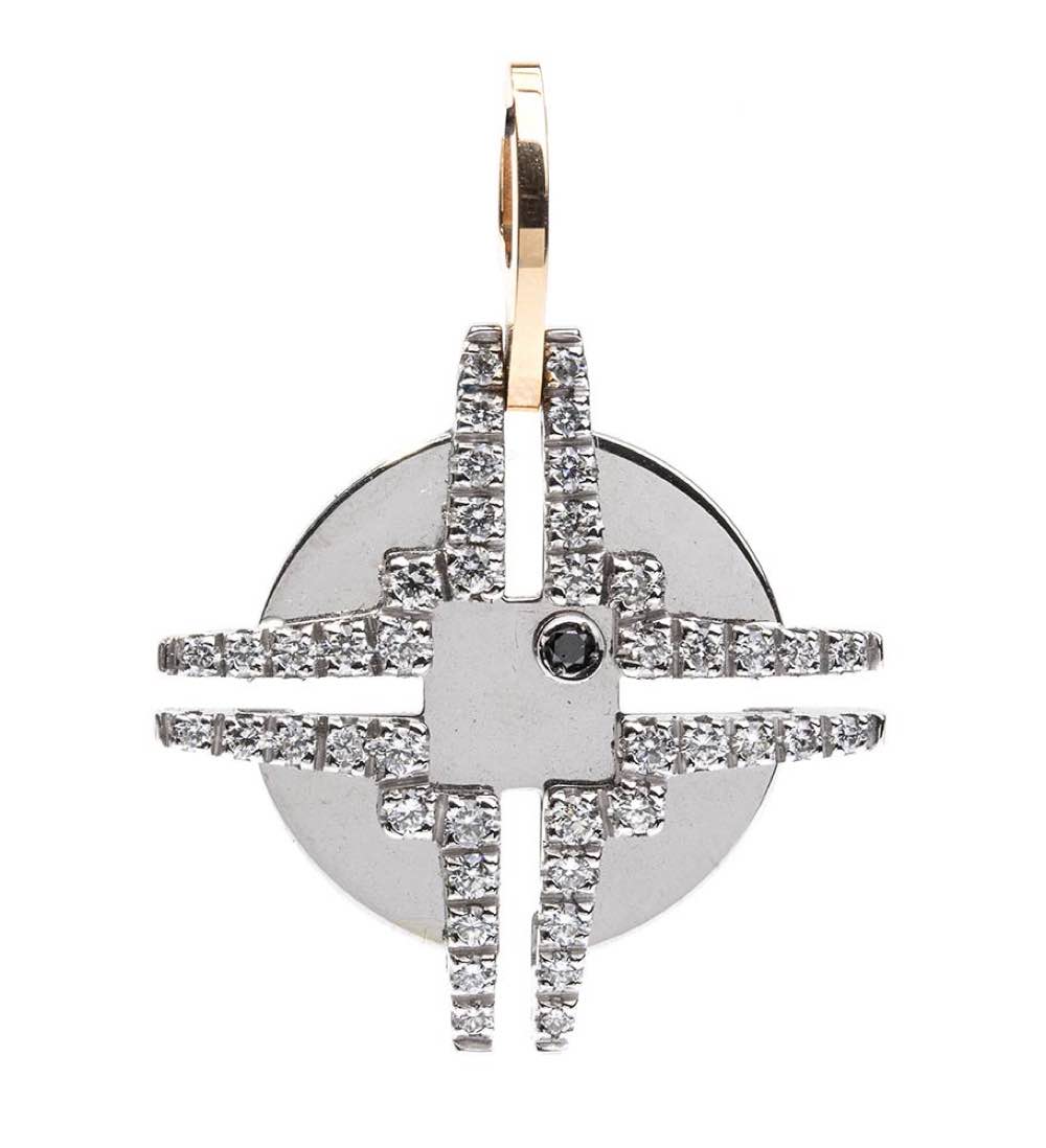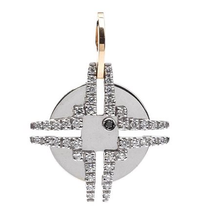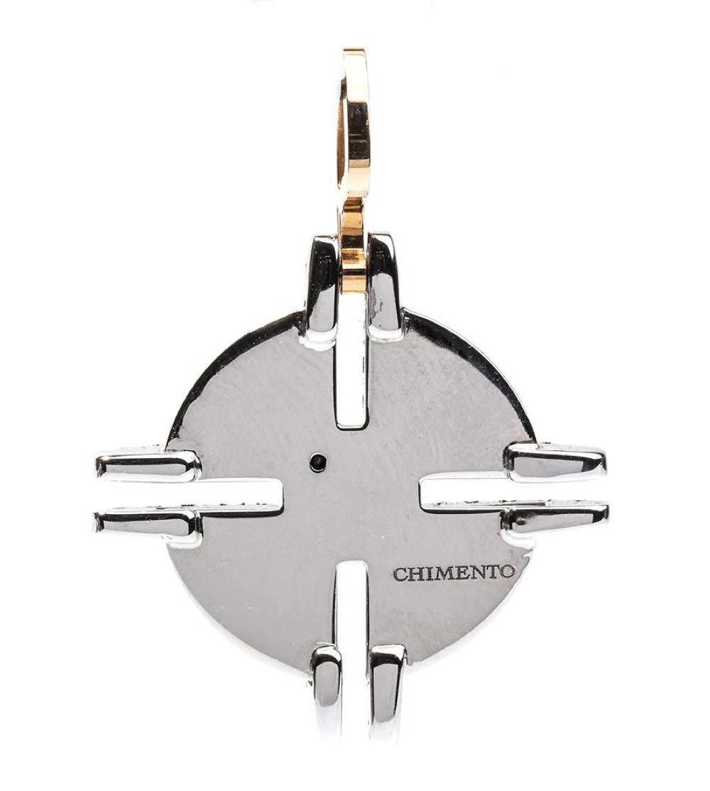 oro bianco e giallo 18k, a forma di croce celtica incastonata con diamanti taglio brilliante 0,75 ct circa, G, VVS. Punzonato "750", "406 VI", "Chimento". Dimensioni fronte 25 x 25 mm. Peso 5,8 gr. Stato di conservazione: ***** eccellente.
