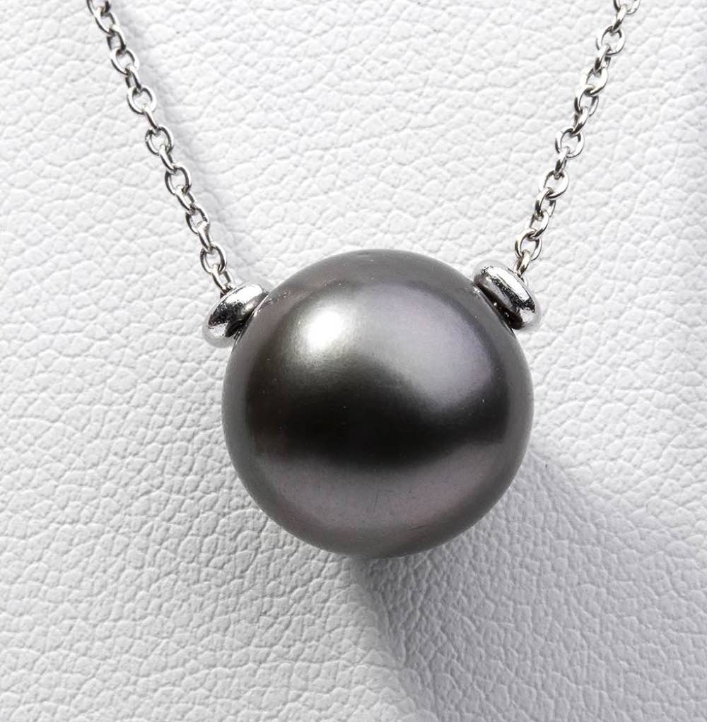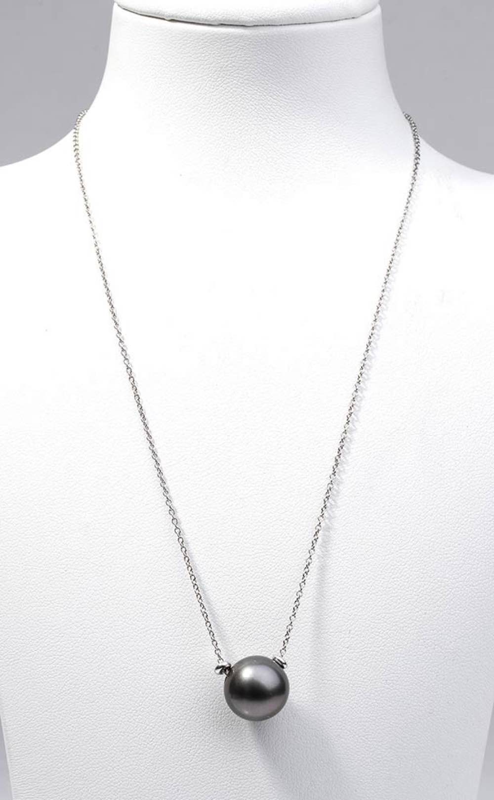 oro 18k, sottile catena a maglia rolo' con perla di Tahiti liberamente scorrevole. Punzonata "750 ", "737 AR". Diametro perla 12,5 mm. Lunghezza collana 48 cm. Peso 5 gr. Stato di conservazione: ***** eccellente.