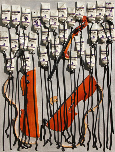 violino spezzato e tubetti di colore su tela riportata su tavola