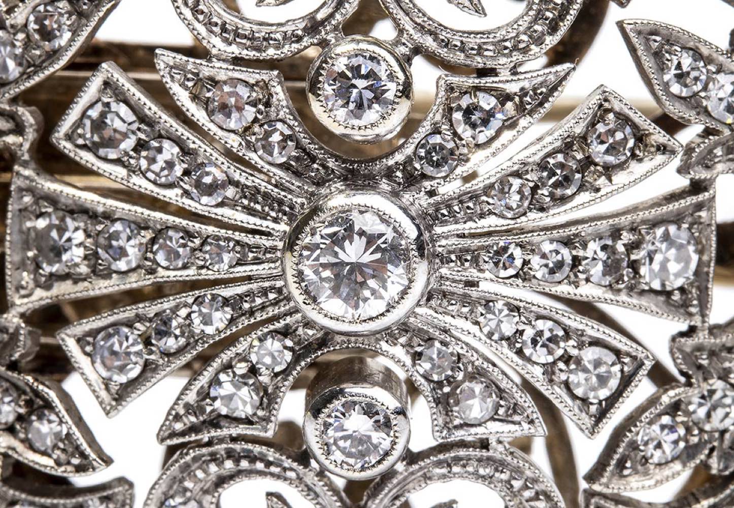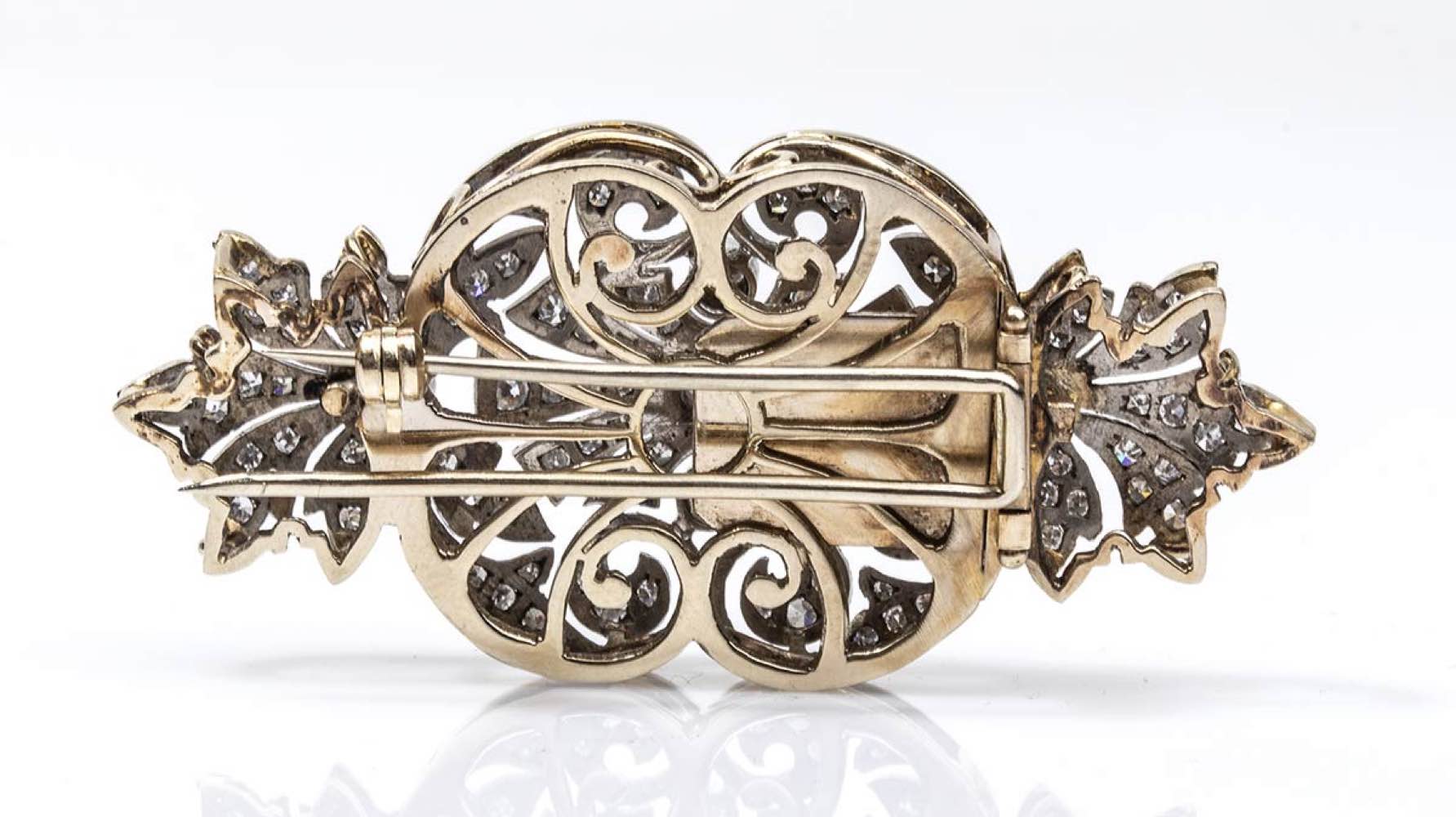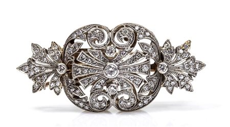 oro bianco 18k incastonata con diamanti taglio brilliante e taglio huit-huit 1,70 ct circa, F-G, VVS. Dimensioni 5,5 x 3 cm. Peso 19,8 gr. Stato di conservazione: ***** eccellente.