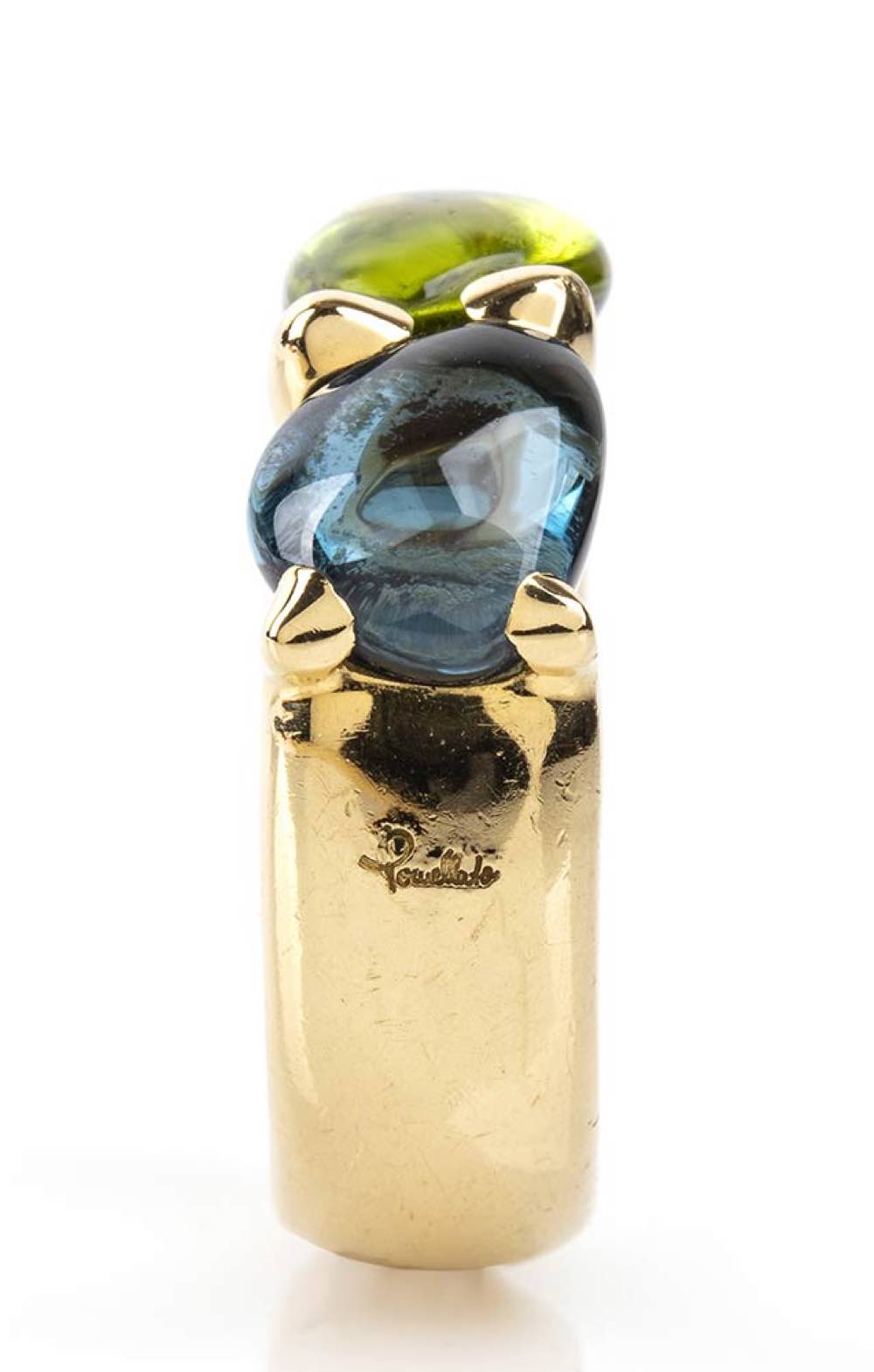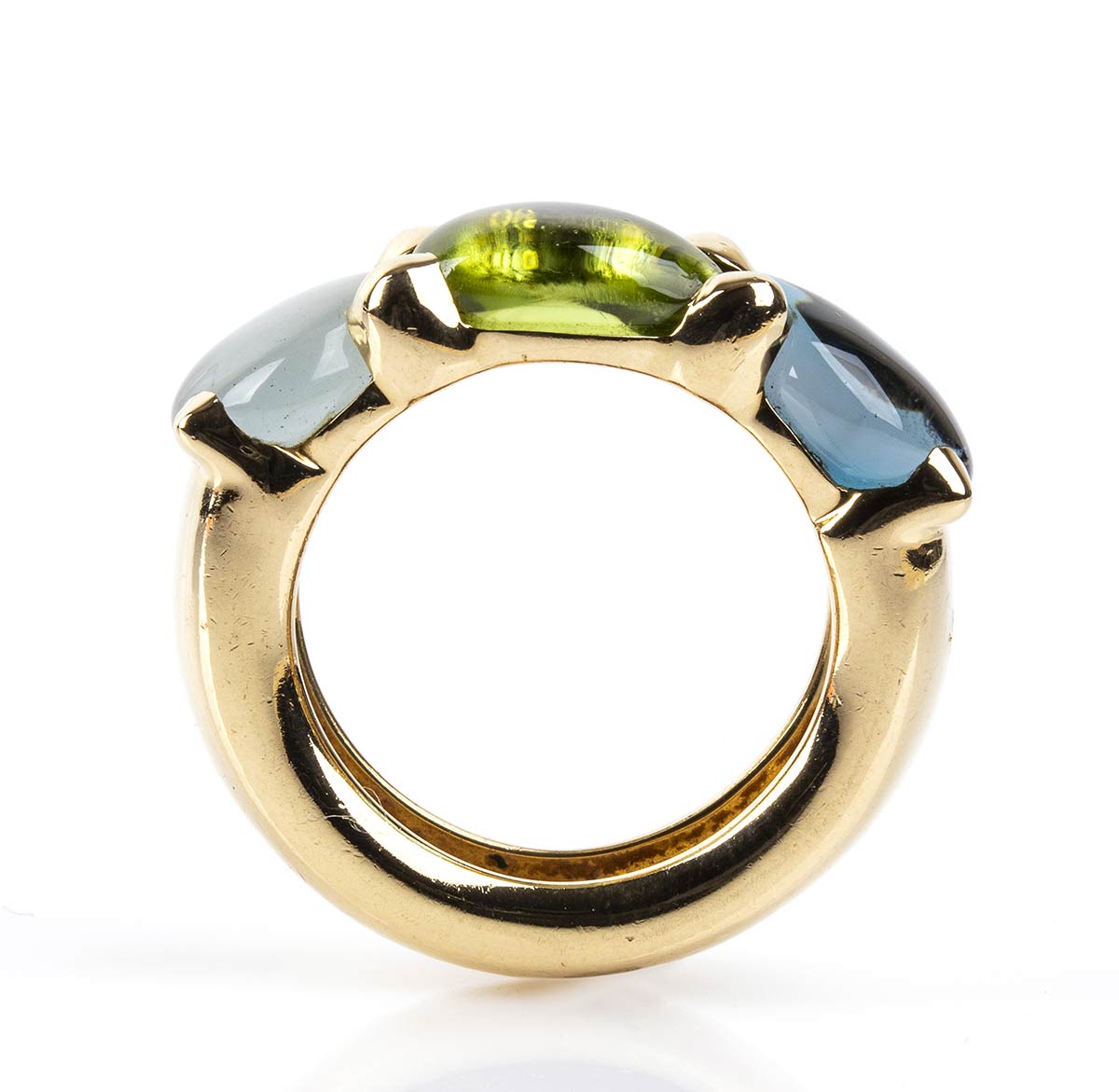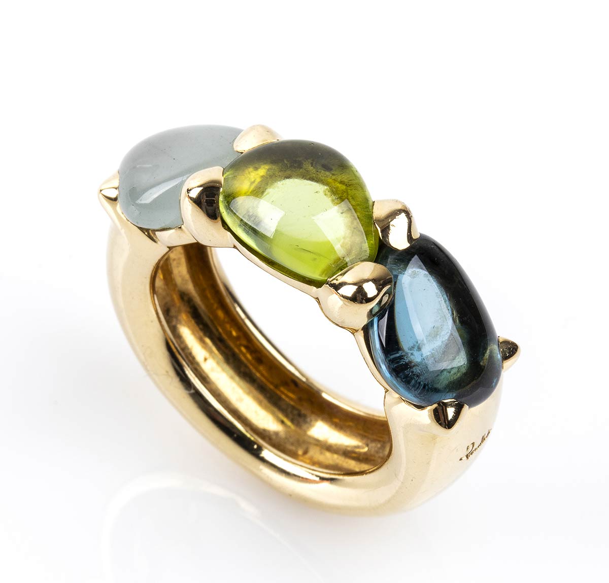oro giallo 18k, collezione "Sassi", incastonato con peridoto, acquamarina e topazio. Punzonato "Pomellato" e "750 - 489 MI". Misura IT 13 - Misura US 6,5. Peso 14,8 gr. Stato di conservazione: ***** eccellente.