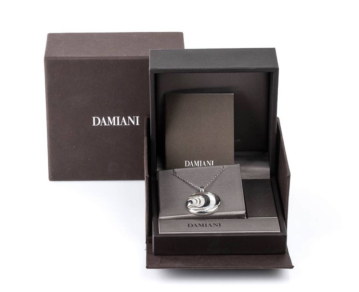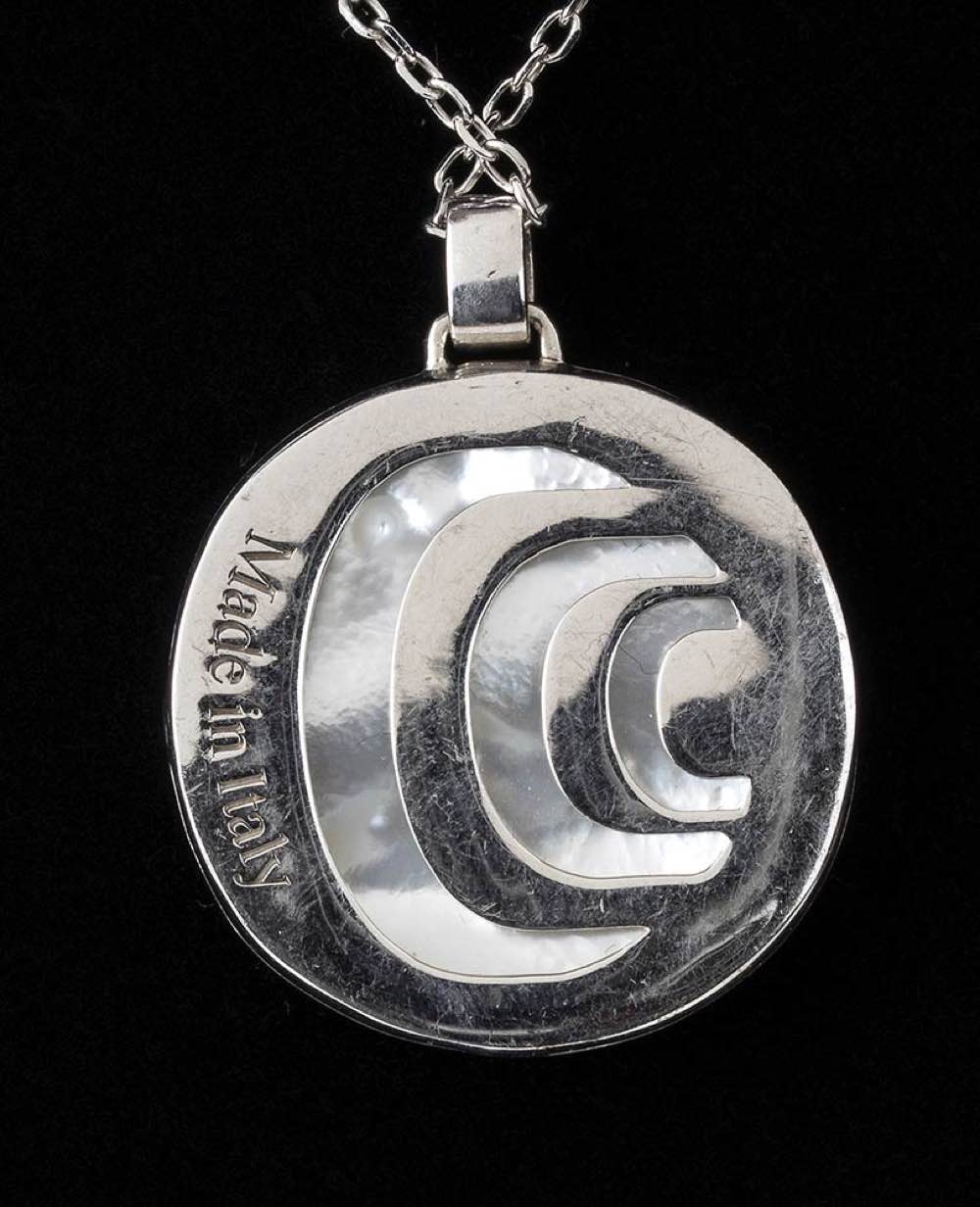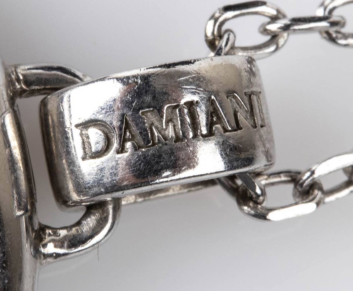argento 925, collezione "Damianissima". Incastonato con madreperla e diamanti taglio brillante 0,09 ct circa, F, VVS. Punzonato "925", "Made in Italy", "3181 AL" e "DAMIANI". Lunghezza 60 cm. Peso 20,6 gr. Stato di conservazione: ***** eccellente.
