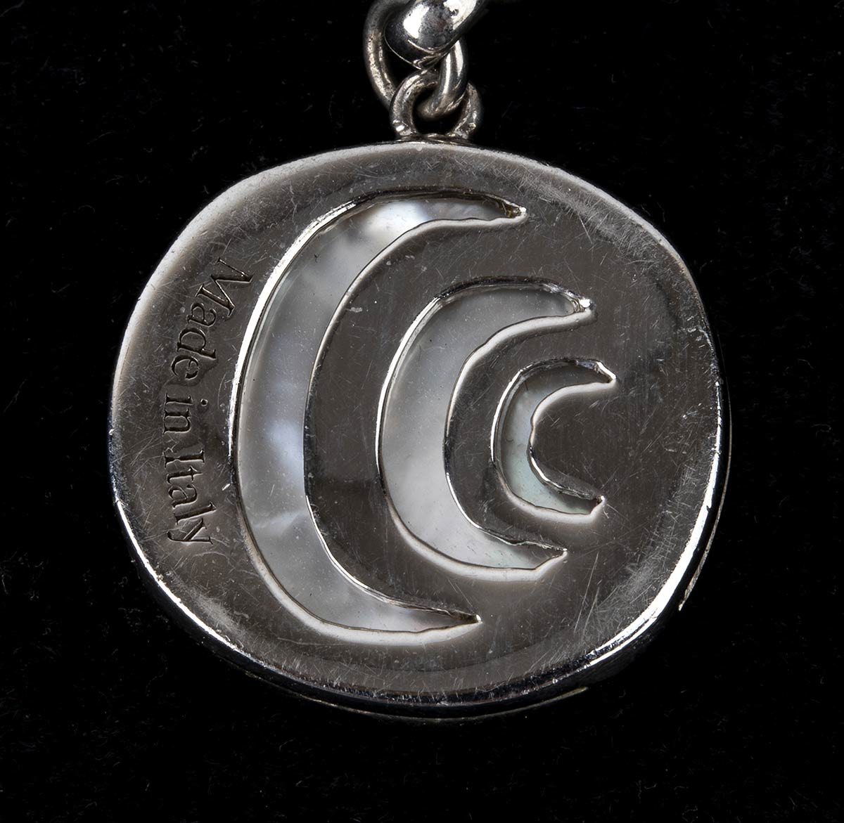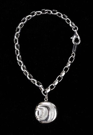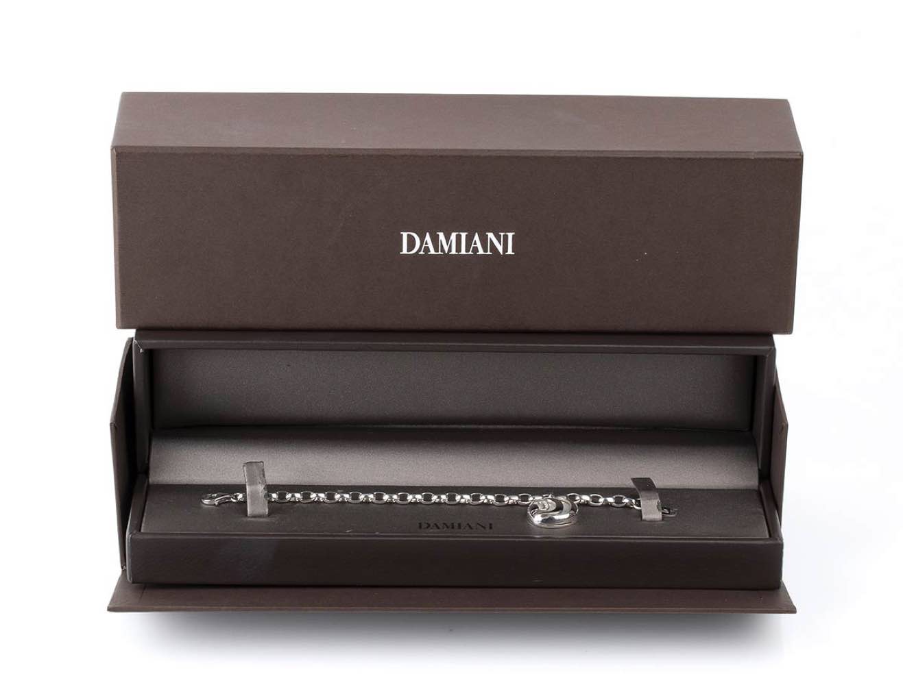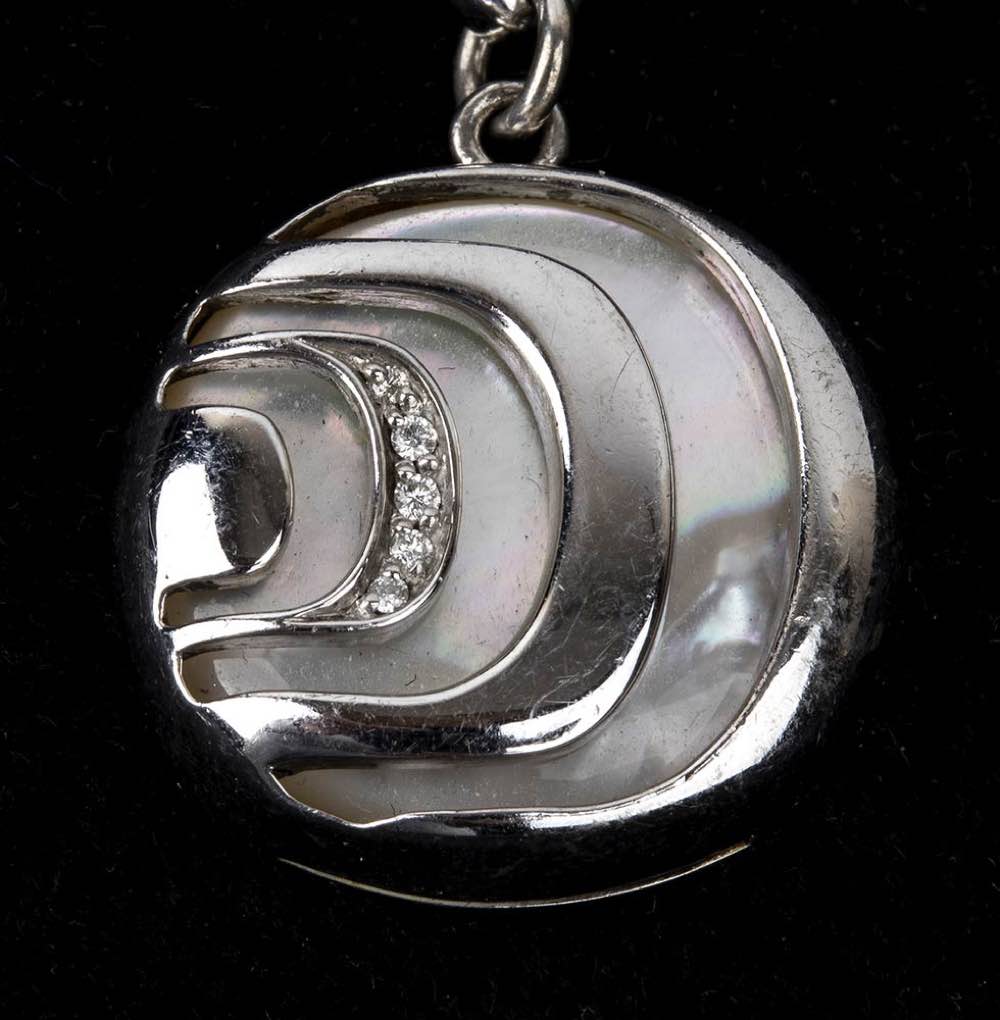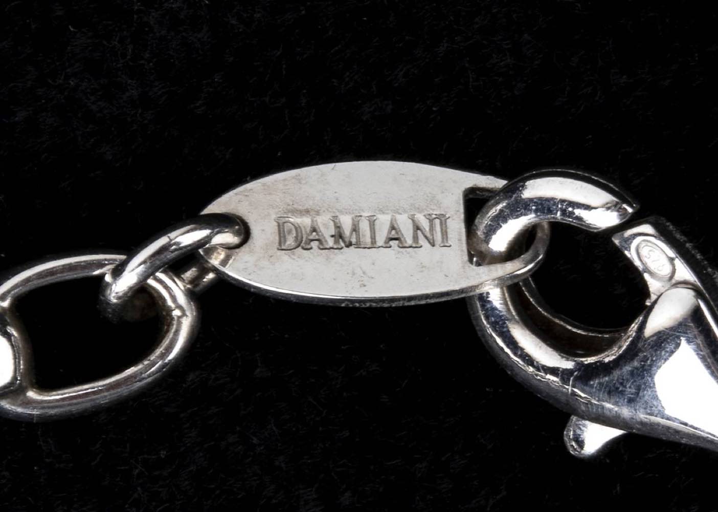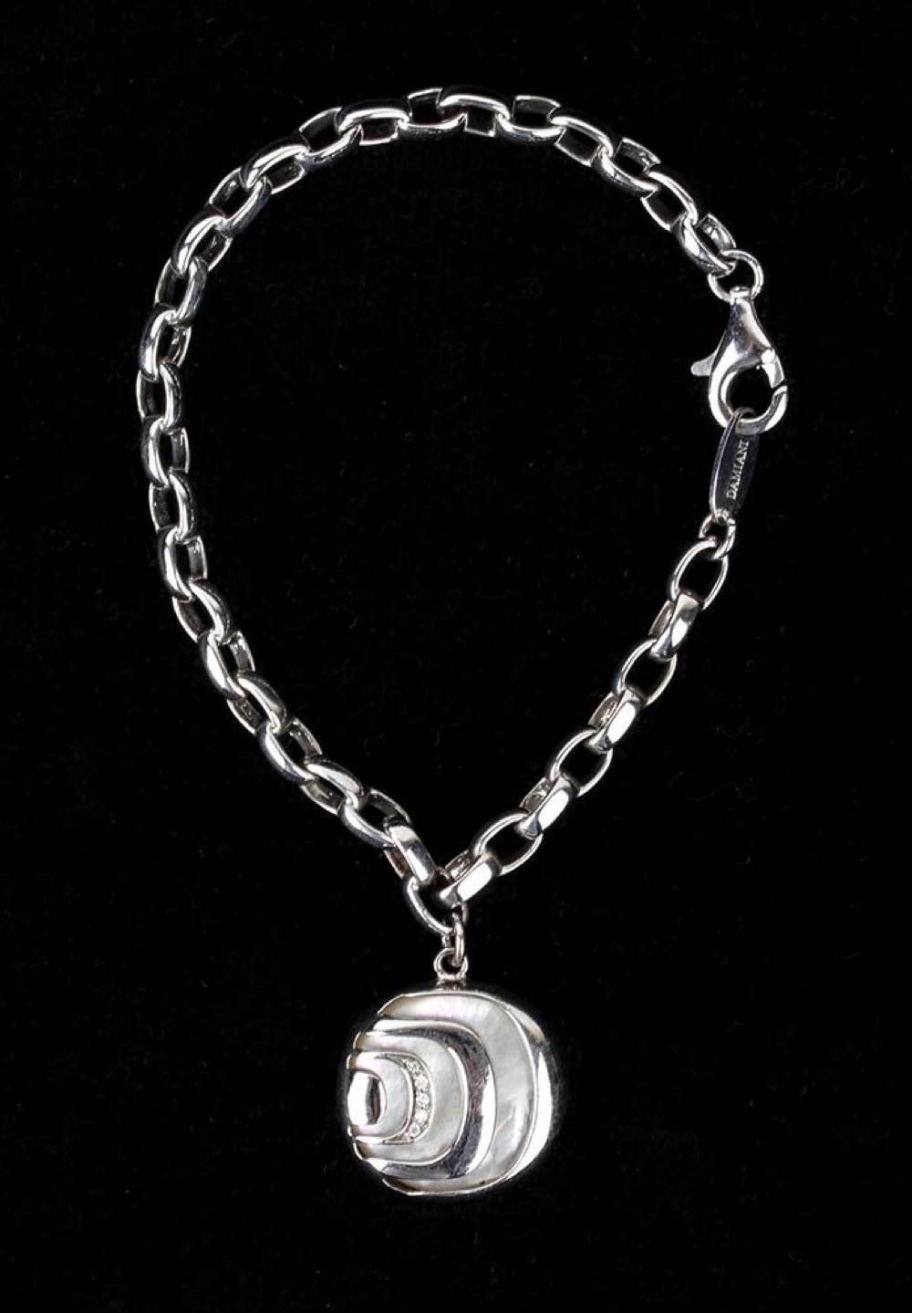 argento 925, collezione "Damianissima". Incastonato con madreperla e diamanti taglio brillante 0,05 ct circa, F, VVS. Punzonato "925", "Made in Italy", "3181 AL" e "DAMIANI". Lunghezza 20 cm. Peso 18,4 gr. Stato di conservazione: ***** eccellente.