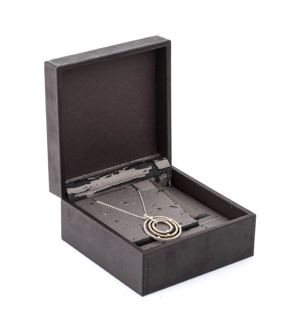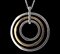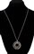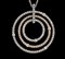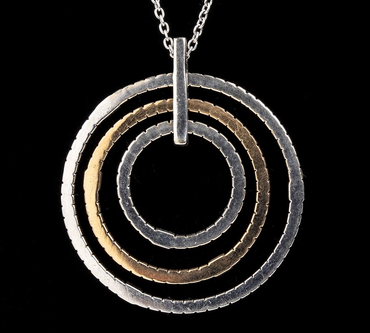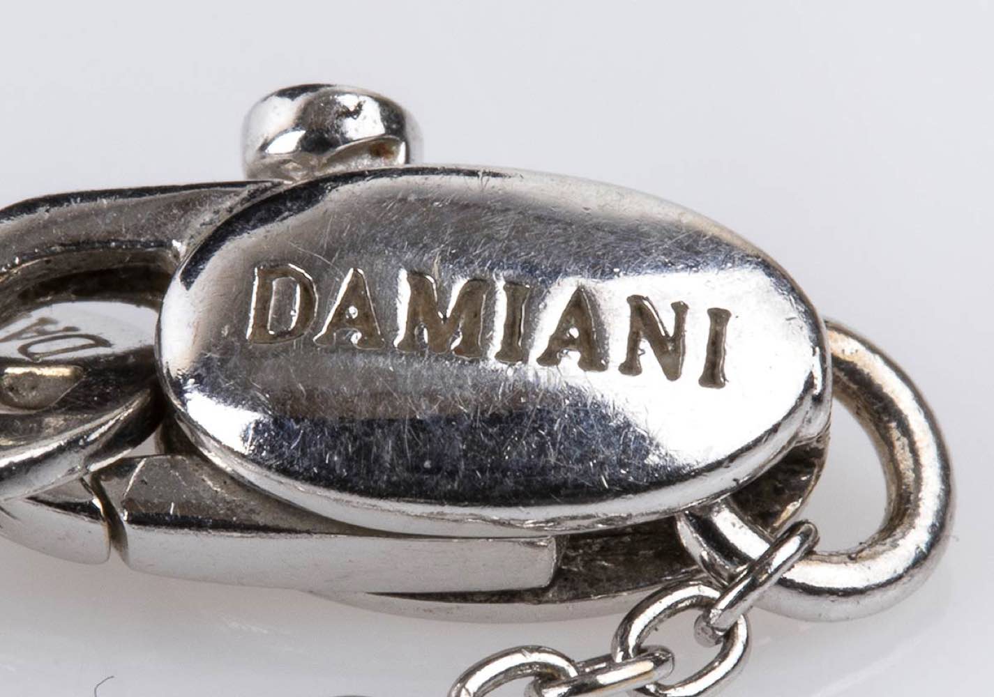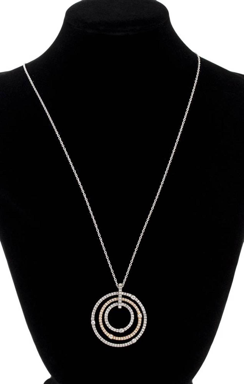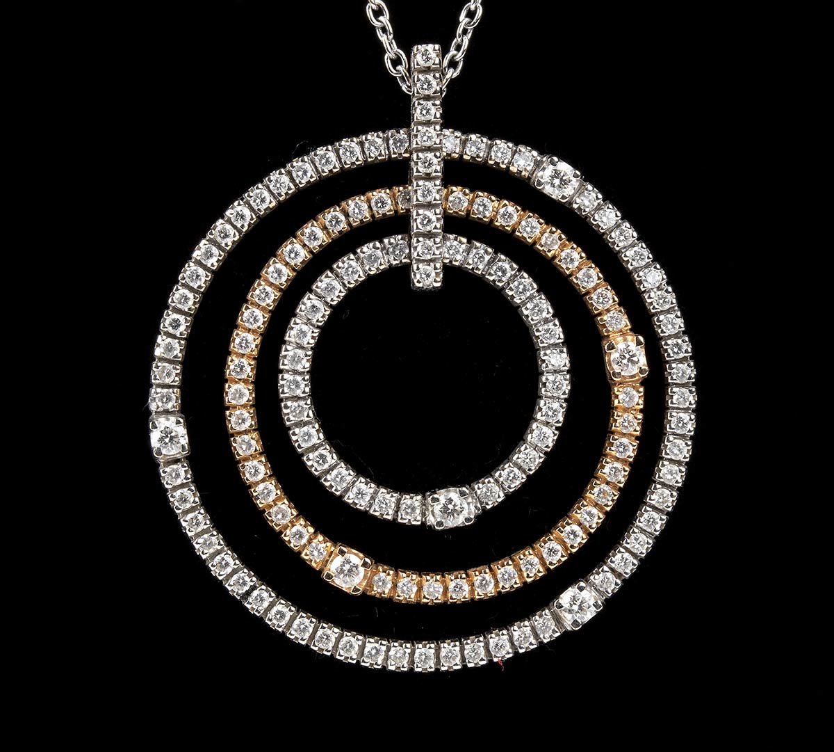 oro bianco e giallo 18k, con sottile catena a maglia forzatina a cui é sospeso un pendente con motivo di cerchi concentrici in diamanti taglio brillante 1,60 ct circa, F, VVS. Punzonato "750", "3181 AL", "Made in Italy" e "DAMIANI". Lunghezza girocollo 50 cm, dimensioni pendente 37 x 34 mm. Stato di conservazione: ***** eccellente.