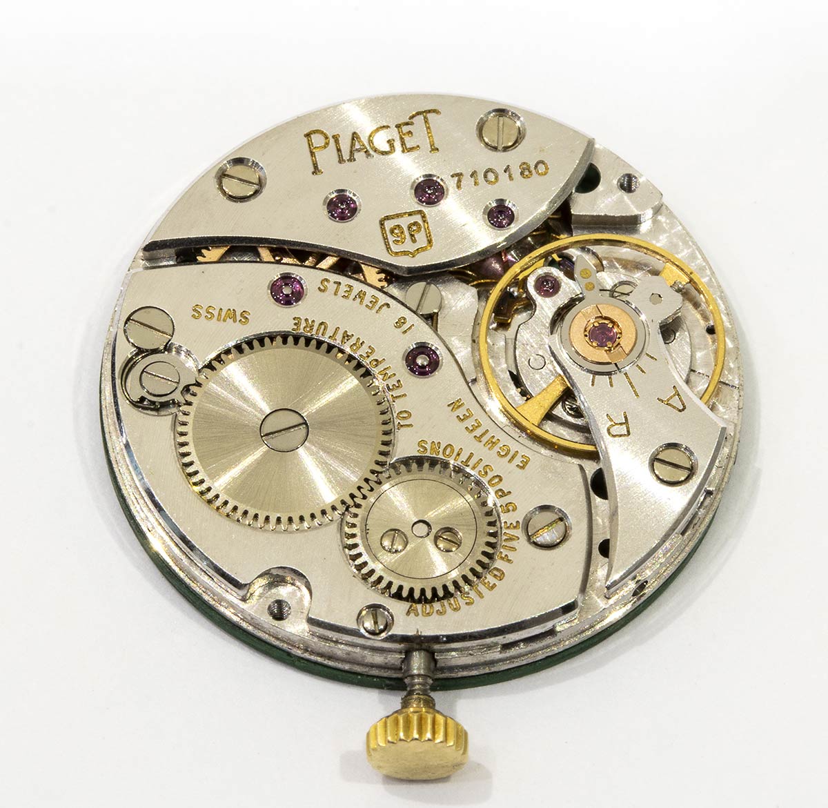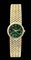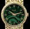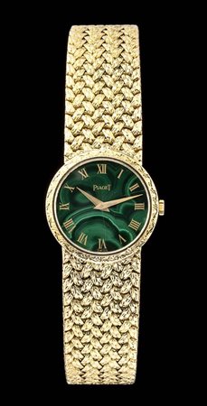 cassa e bracciale in oro giallo 18k, quadrante malachite con numeri romani. Movimento a carica manuale 18j. referenza 924 D2. Diametro della cassa 24 mm, lunghezza 16,5 cm. Stato di conservazione: *** discreto (difetti al quadrante in malachite).