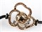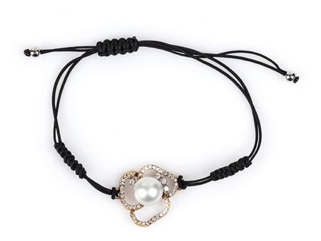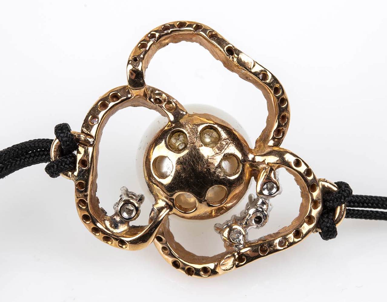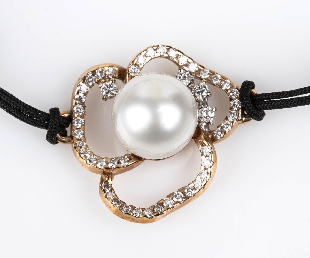 lunghezza regolabile con cordoncino in tessuto, al centro una perla coltivata d'acqua salata contornata da motivo di nastri in oro giallo 18k incastonati con diamanti taglio brillante 0,46 ct circa, G-H, VVS-VS. Diametro perla 9,5-10 mm. Dimensioni centrale 20 x 20 mm. Peso 5,6 gr. Stato di conservazione: ***** eccellente.