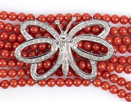 composto da otto fili di piccole sfere di corallo Mediterraneo (corallium rubrum), con farfalla centrale in oro bianco 18k incastonata con diamanti taglio brillante 1,00 ct circa, G, VVS-VS. Punzonato "750". Lunghezza 18 cm, larghezza 3 cm. Peso 50,4 gr. Stato di conservazione: ***** eccellente.