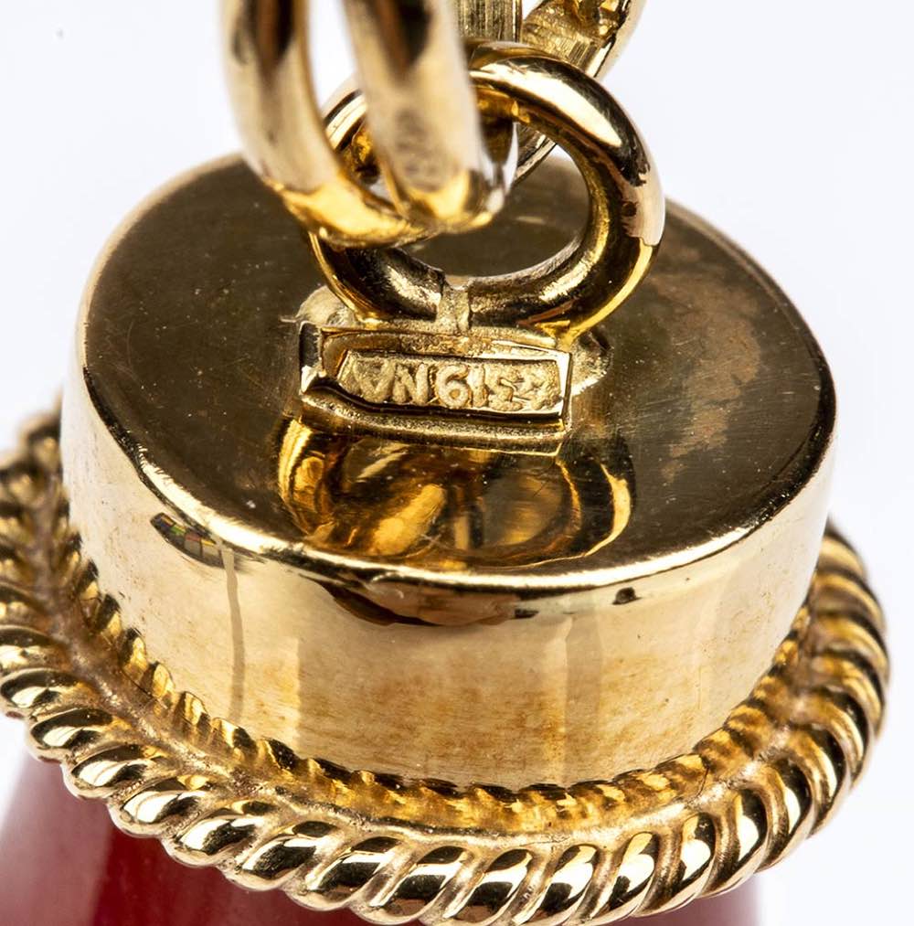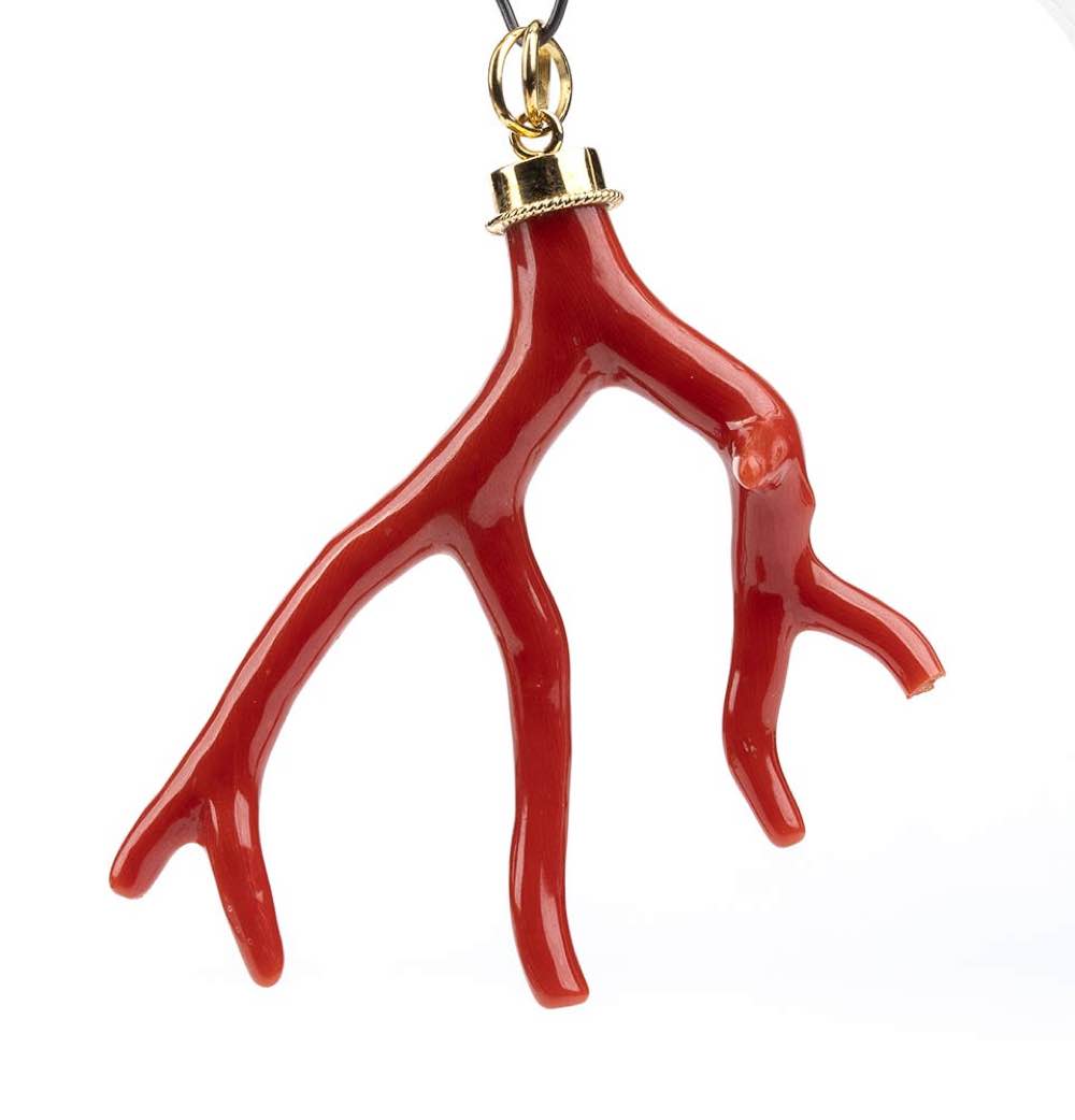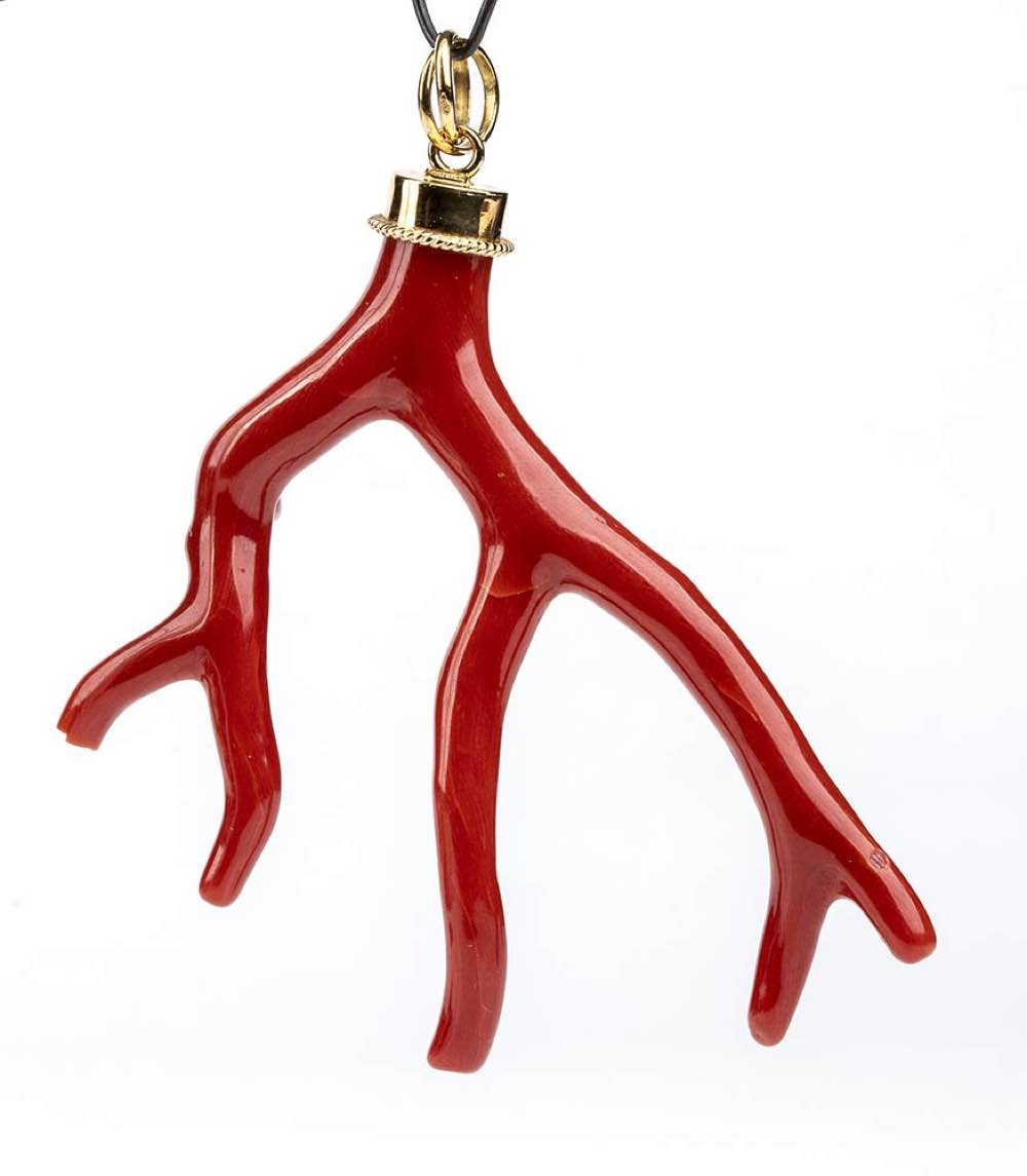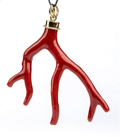 oro giallo 18k, incastonato con rametto di corallo Mediterraneo (corallium rubrum). Punzonato "750". Dimensioni 70 x 70 mm. Peso 14,3 gr. Stato di conservazione: ***** eccellente.