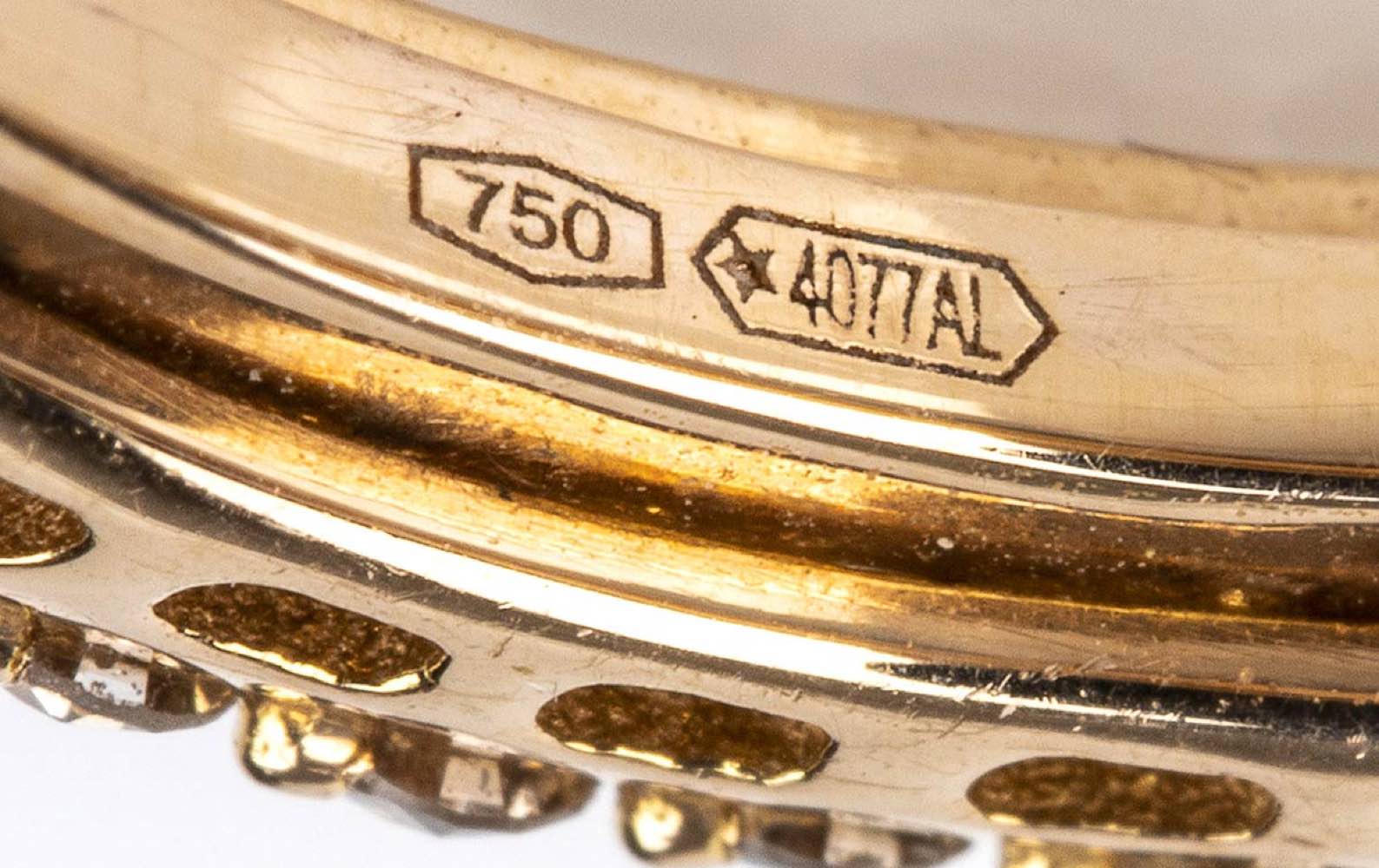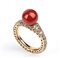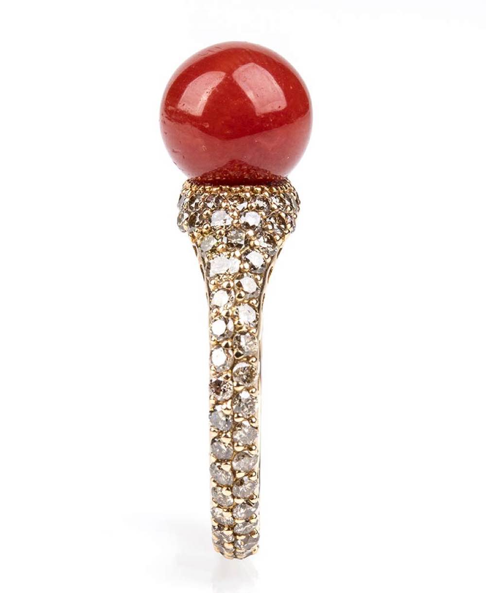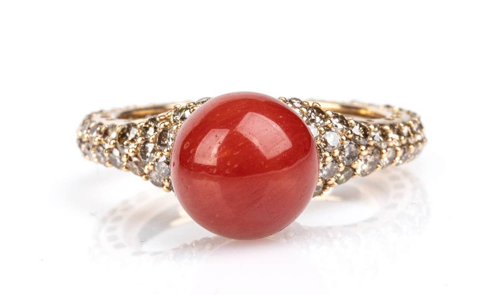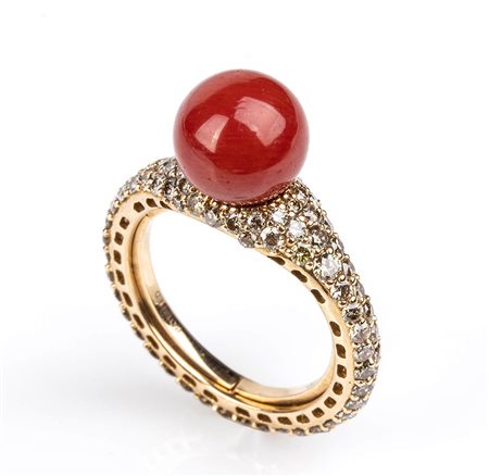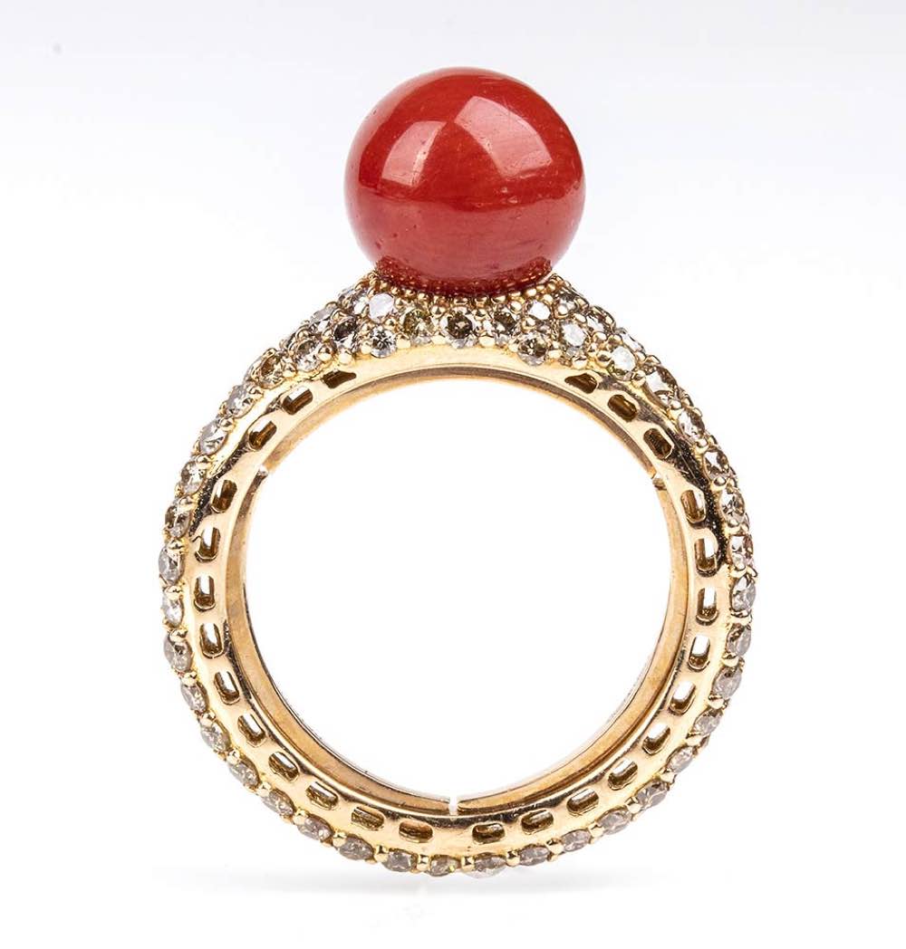 oro bianco 18k, con corallo Mediterraneo (corallium rubrum) contornato da pavé di diamanti brown 1,80 ct circa. Diametro sfera corallo 9,5 mm. Peso 6,9 gr. Punzonato "750", "4477 AL" e "patented". Misura IT 17 - Misura US 8. Stato di conservazione: ***** eccellente.