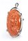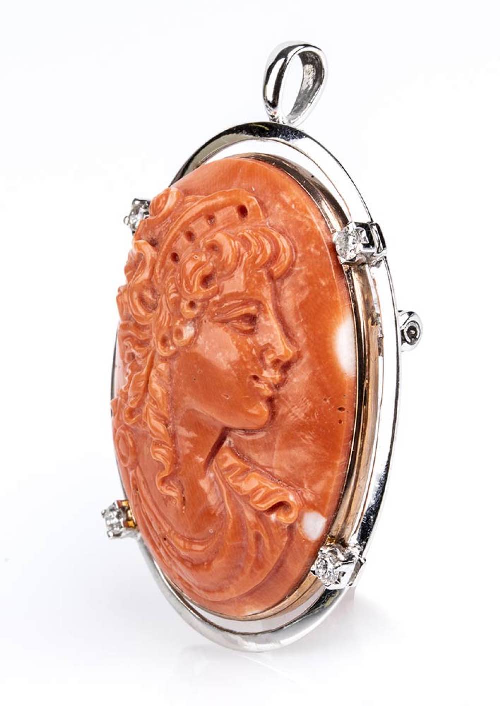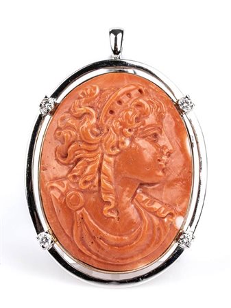 oro bianco 18k, di forma ovale, incastonato con cammeo scolpito in corallo Cerasuolo (corallium elatius) raffigurante un profilo femminile; dettagli in diamanti taglio brillante 0,33 ct circa, G, VVS-VS. Punzonato "750", "307 NA". Dimensioni 52 x 40 mm. Peso 22,2 gr. Stato di conservazione: ***** eccellente.