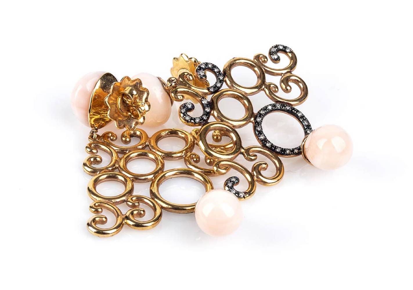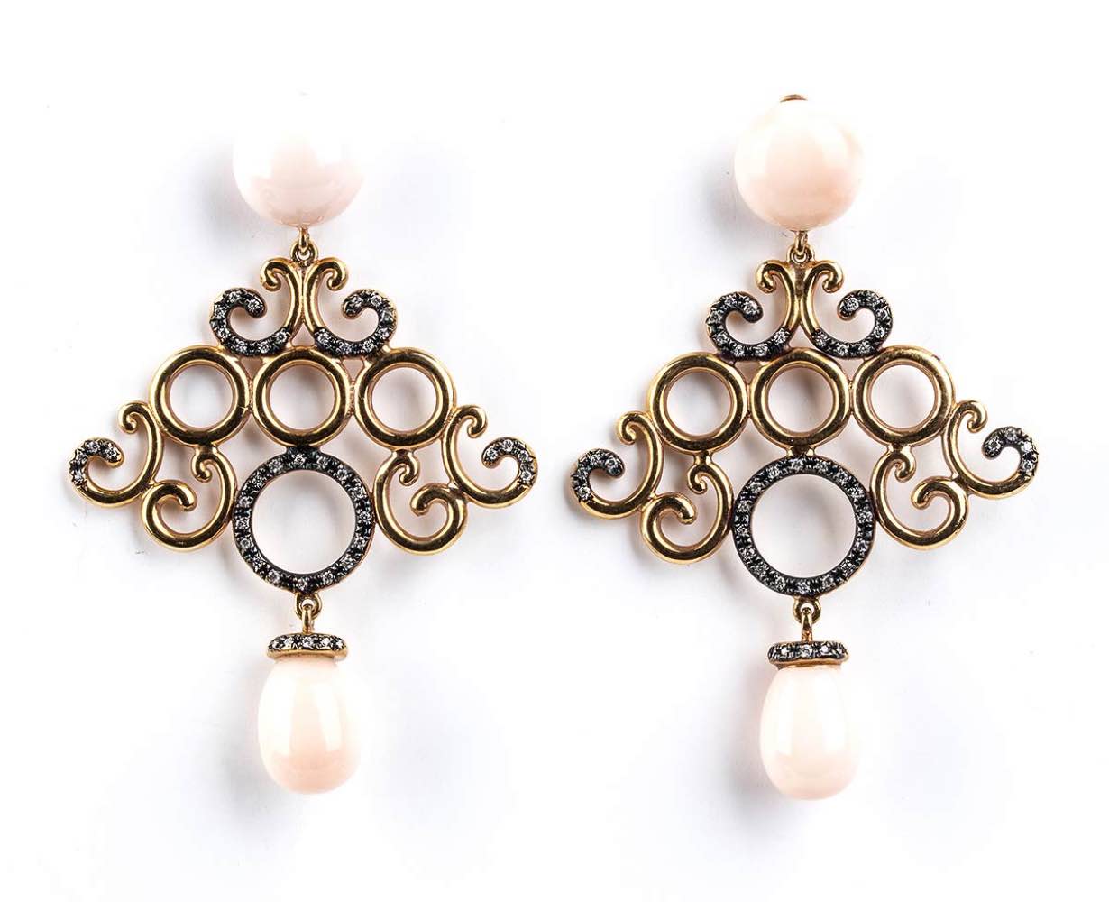 oro giallo 18k, motivo "chandelier" con corallo rosa (corallium secundum) e nastri in diamanti taglio brillante 0,72 ct circa totali, H, VS-SI. Punzonati "750". Dimensioni 60 x 40 mm. Peso 26,2 gr. Stato di conservazione: ***** eccellente.