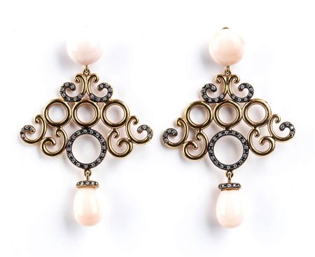 Orecchini pendenti in oro, corallo rosa e diamanti