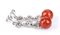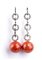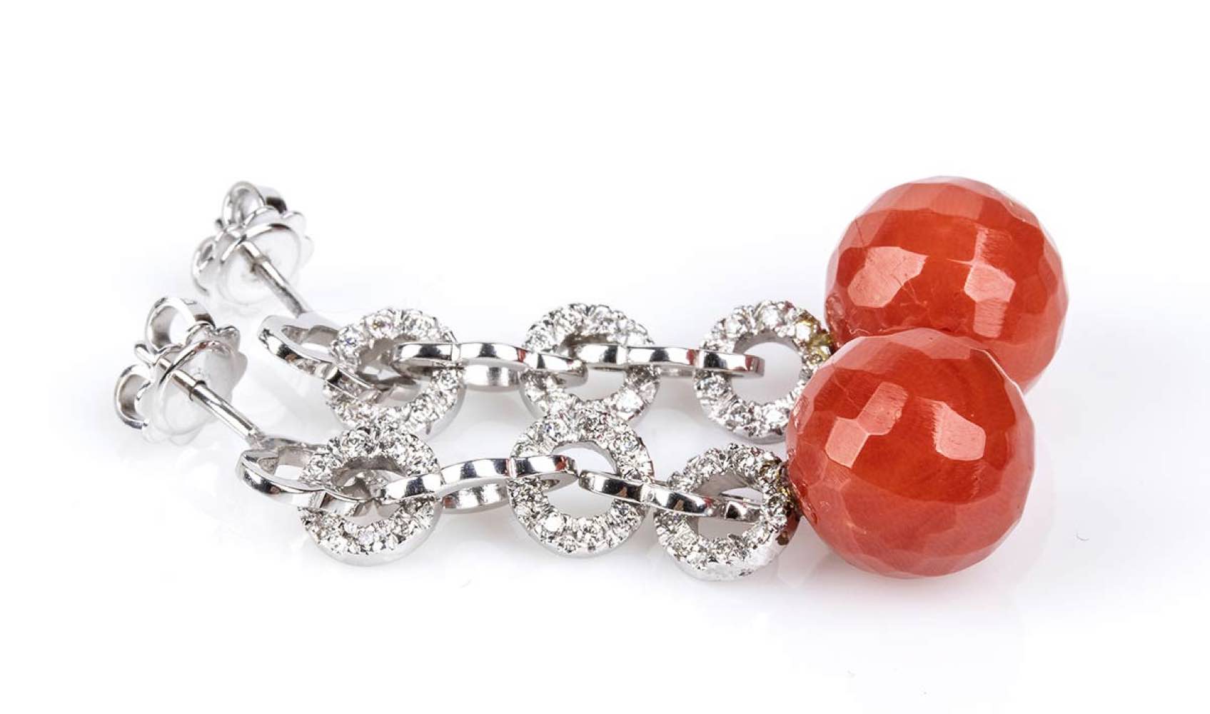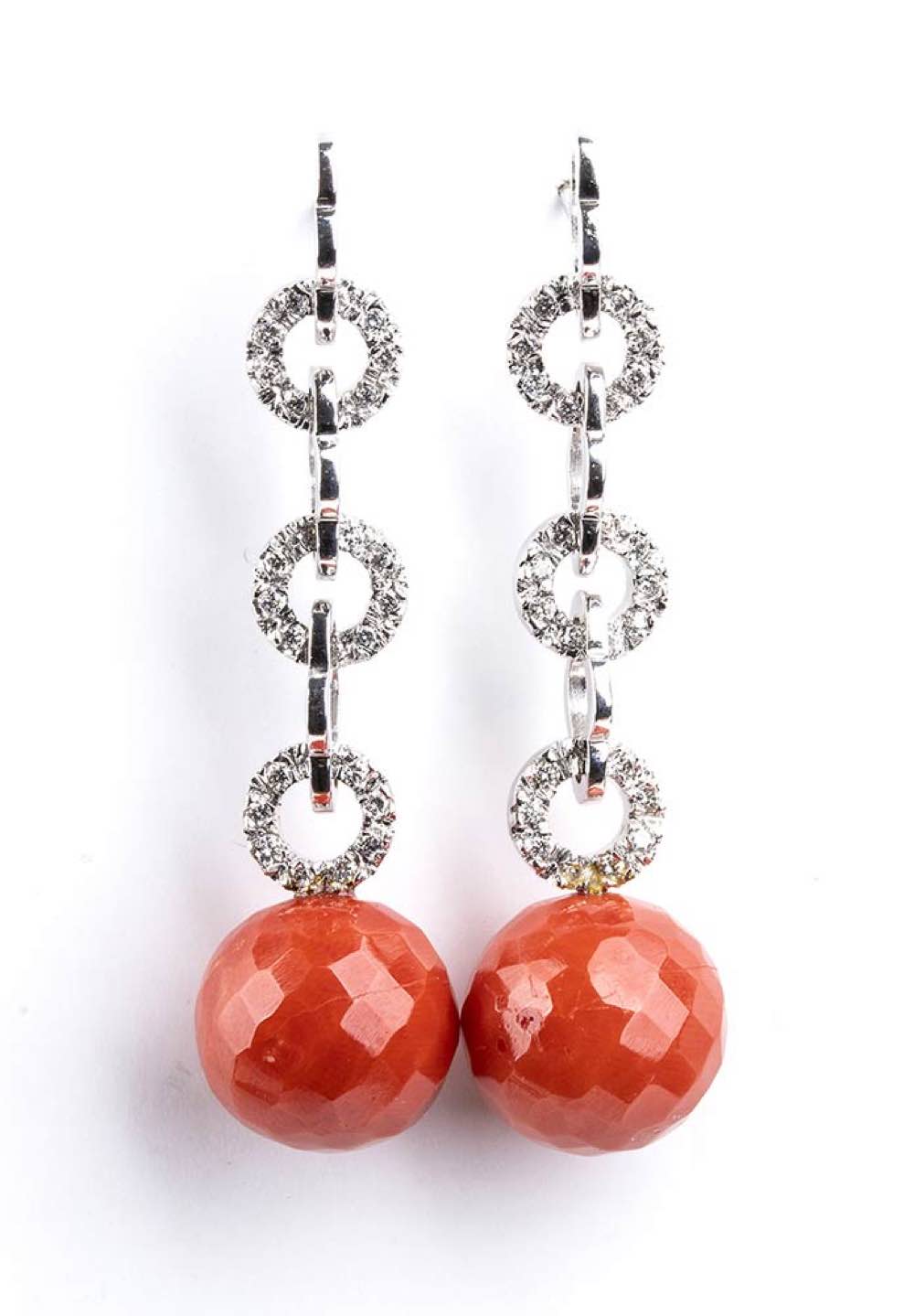 oro bianco 18k, ciascuno con sfera sfaccettata di corallo Mediterraneo (corallium rubrum) sormontato da linea di elementi geometrici in diamanti taglio brillante 0,46 ct circa totali, G, VS. Punzonati "750". Lunghezza 40 mm, diametro corallo 12-12,5 mm. Peso 12 gr. Stato di conservazione: ***** eccellente.