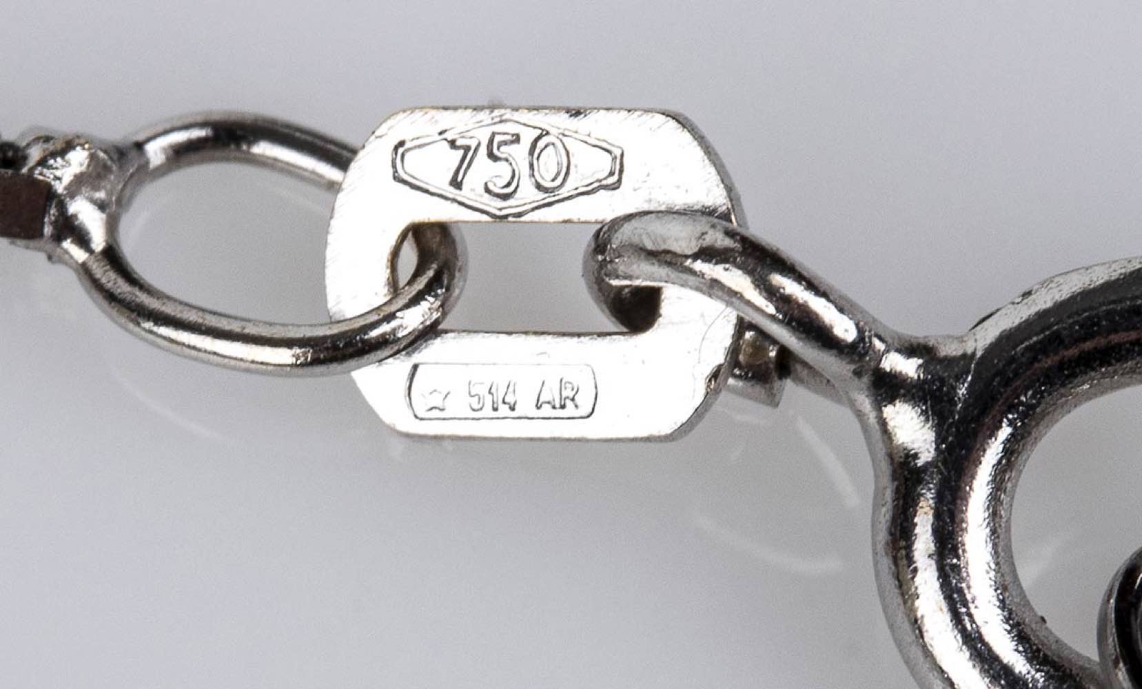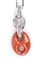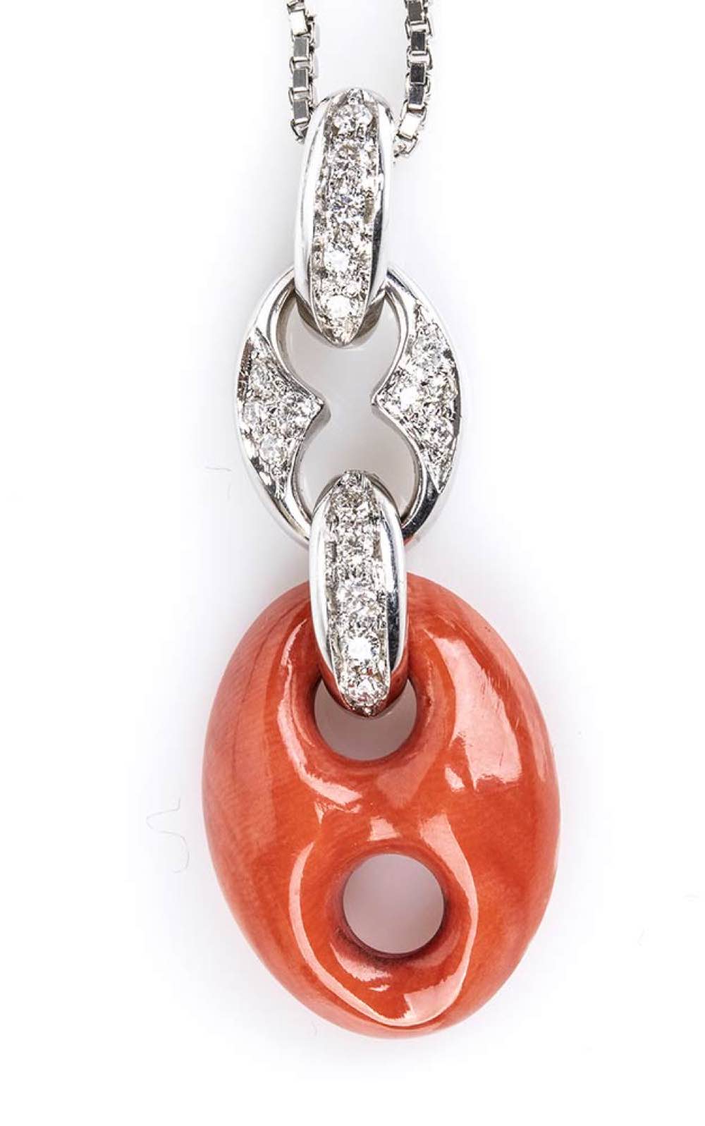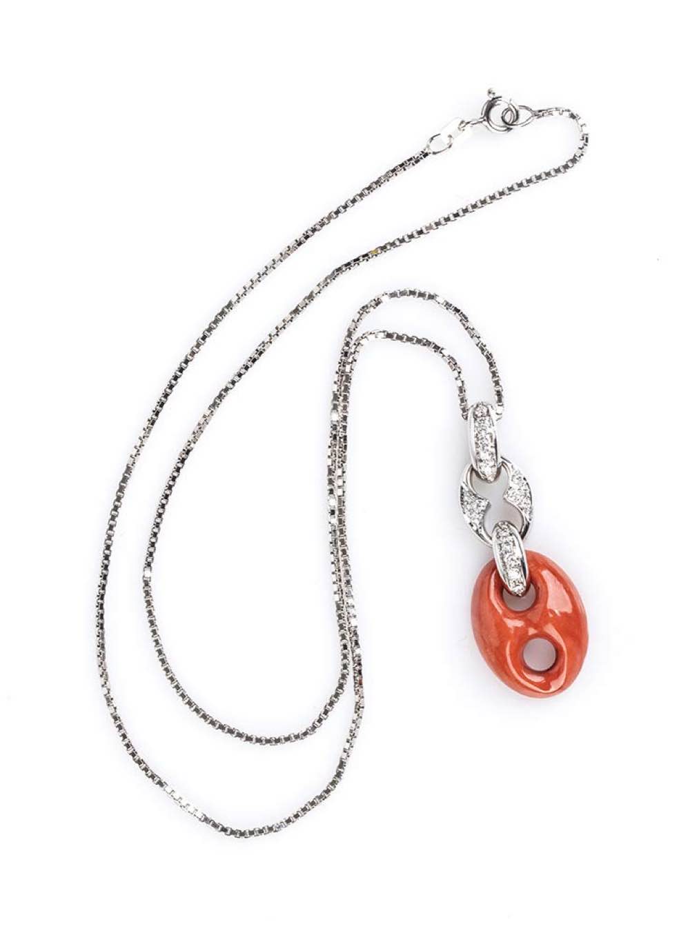 oro bianco 18k, pendente in corallo Cerasuolo (corallium elatius) sormontato da pavé di diamanti taglio brillante 0,27 ct circa, G, VVS-VS. Punzonato "750", "514 AR". Lunghezza pendente 40 mm. Lunghezza catenina 44 cm. Peso 9,5 gr. Stato di conservazione: ***** eccellente.