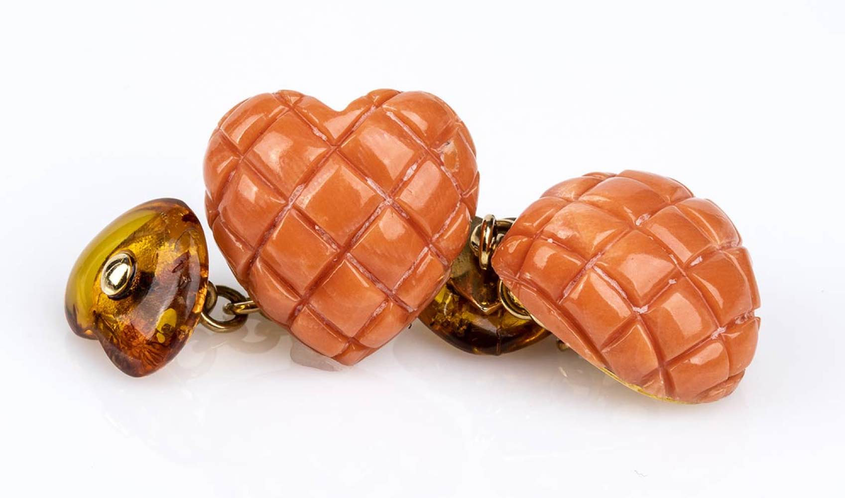 oro giallo 18k, ciascuno con corallo Cerasuolo (corallium elatius) ed ambra scolpiti a forma di cuore e piccolo diamante. Punzonati "750", "92 GE" e "ROVIAN". Dimensioni fronte 15 x 15 mm. Peso 9,2 gr. Stato di conservazione: ***** eccellente.