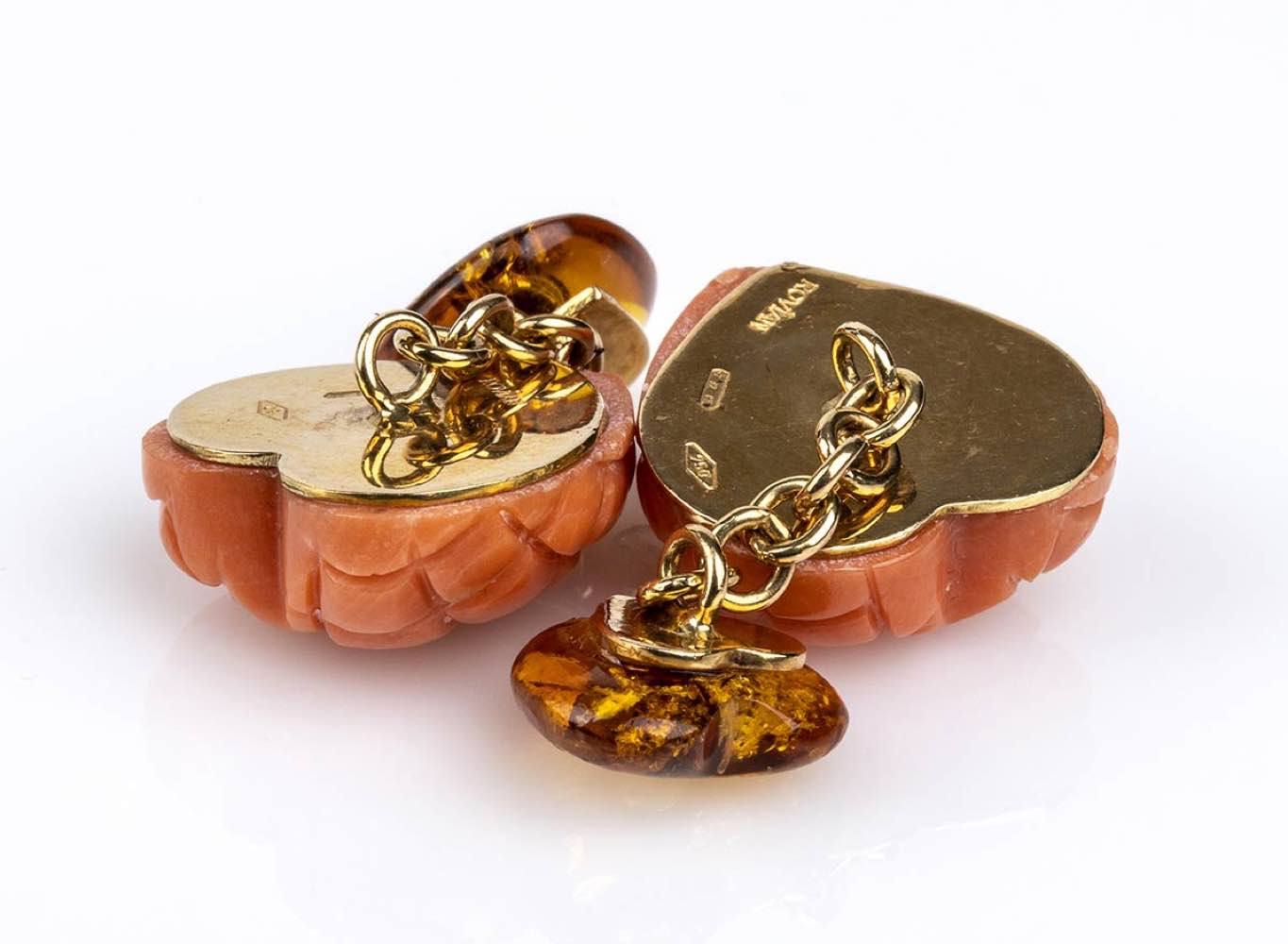 Gemelli in oro, corallo Cerasuolo, ambra e diamante - manifattura ROVIAN