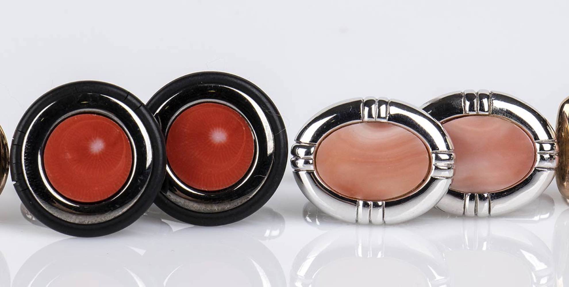 argento 925/1000, corallo Cerasuolo (corallium elatius) e corallo Mediterraneo (corallium rubrum). Diametro coralli da 15 a 18 mm. Peso complessivo 44 gr. Stato di conservazione: ***** eccellente.