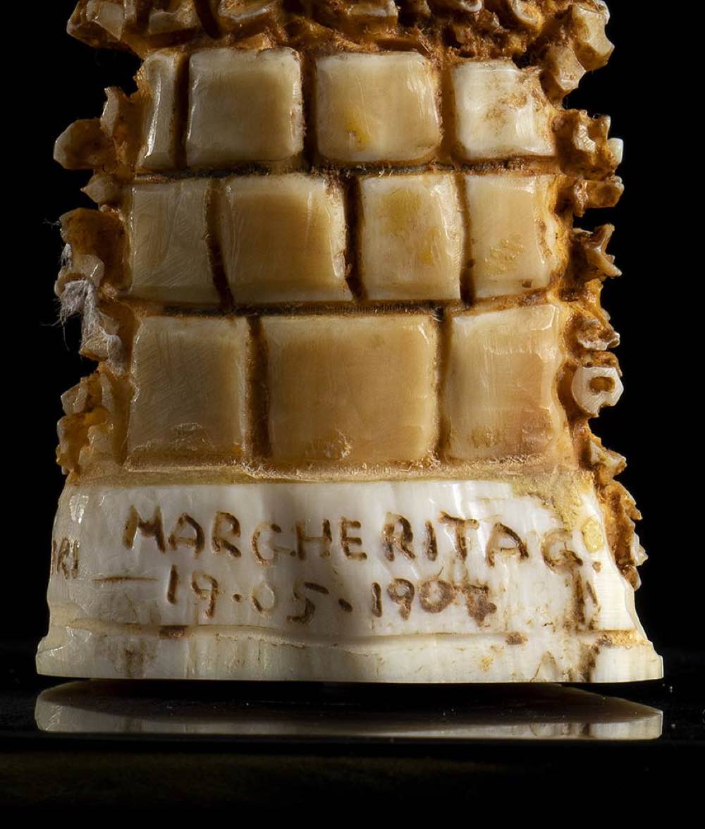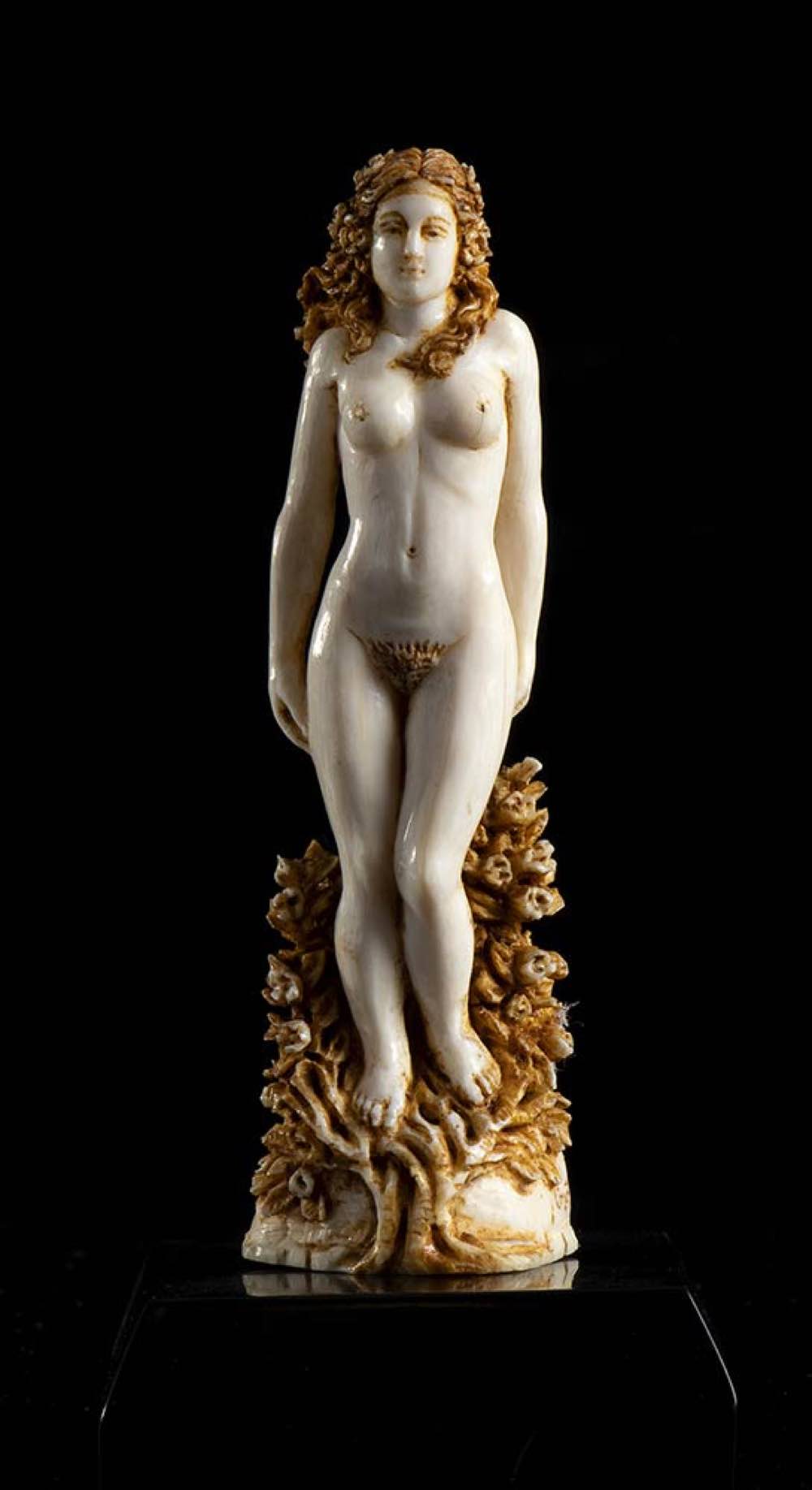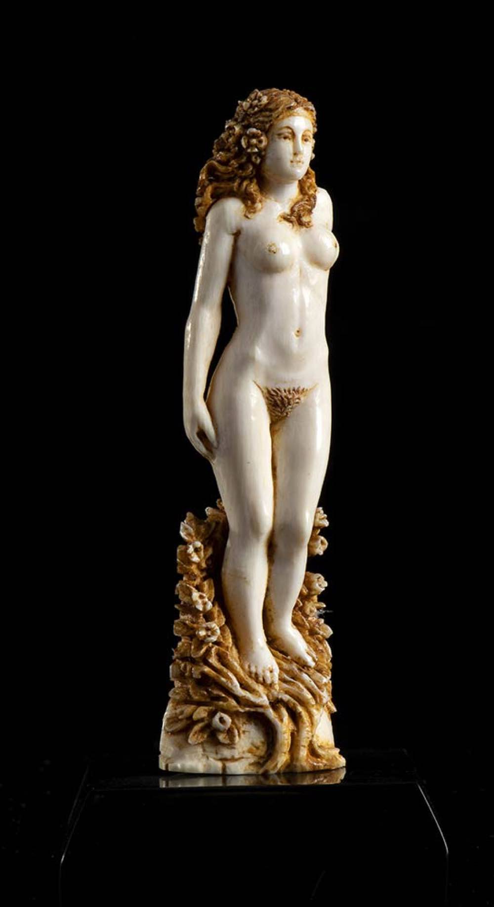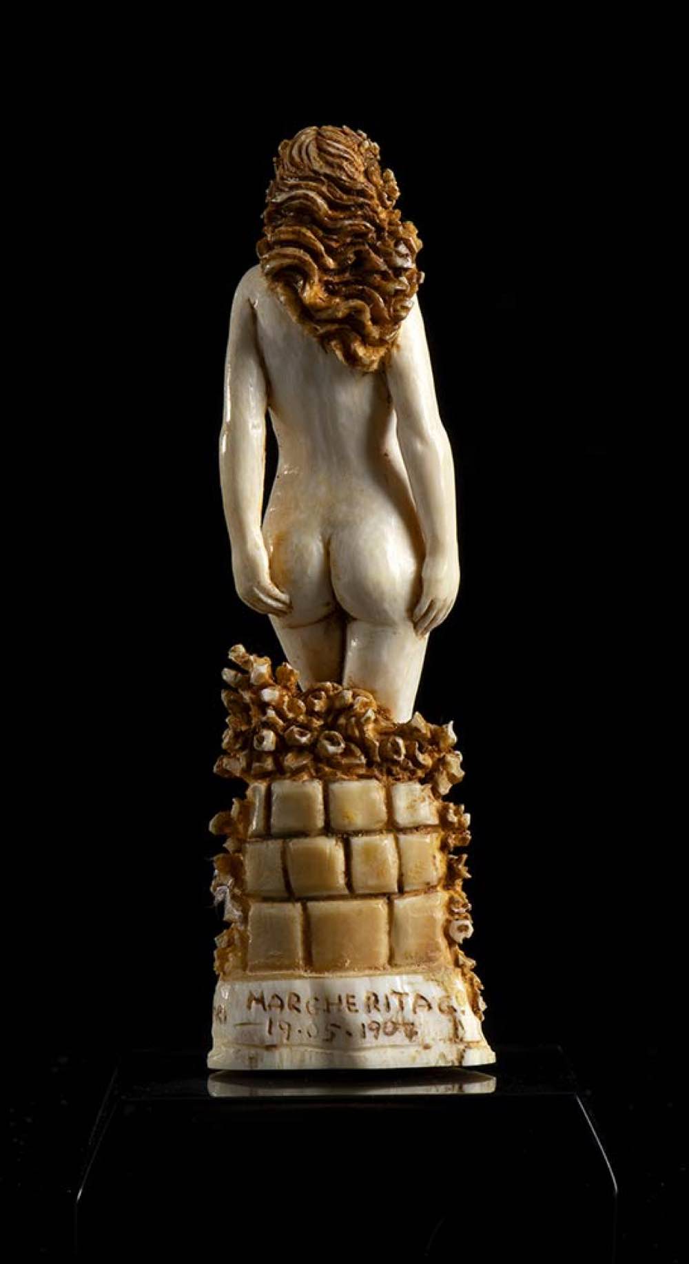in avorio di elefante scolpito (Elephas maximus Linnaeus, 1758 o Loxodonta africana Blumenbach, 1797) raffigurante una figura femminile posta su una base in marmo nero. Firmata "Ganeri" con iscrizione "Margherita 19/5/1907". Dimensioni scultura 11,7 x 3,5 x 2,7 cm, base 2 x 6,5 x 6,5 cm. Peso scultura 63,8 gr, peso totale 224,1 gr. Stato di conservazione: ***** eccellente. Accompagnato da certificato di autenticità Ce.S.Ar. Centro Studi Archeometrici (pre-1947).