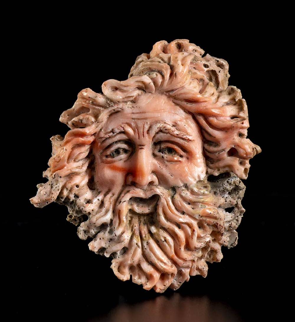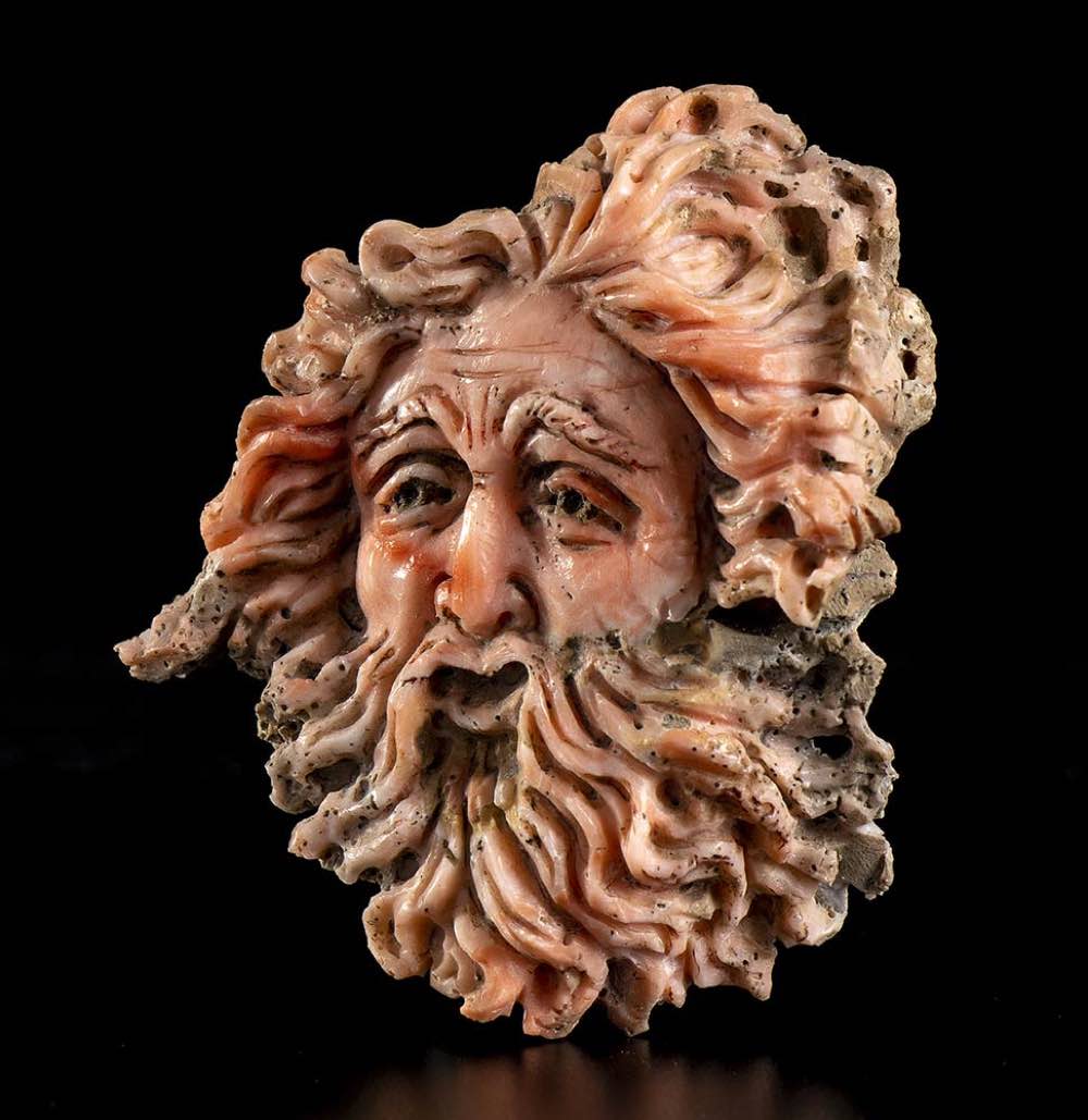 (corallium elatius) raffigurante il volto di Eolo. Dimensioni 6 x 5,5 x 15 cm. Peso scultura 37,5 gr. Stato di conservazione: ***** eccellente.